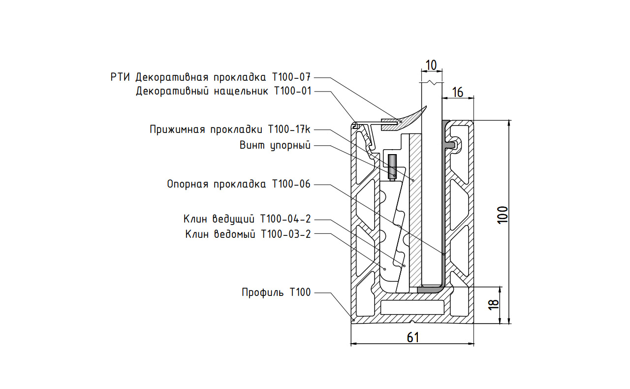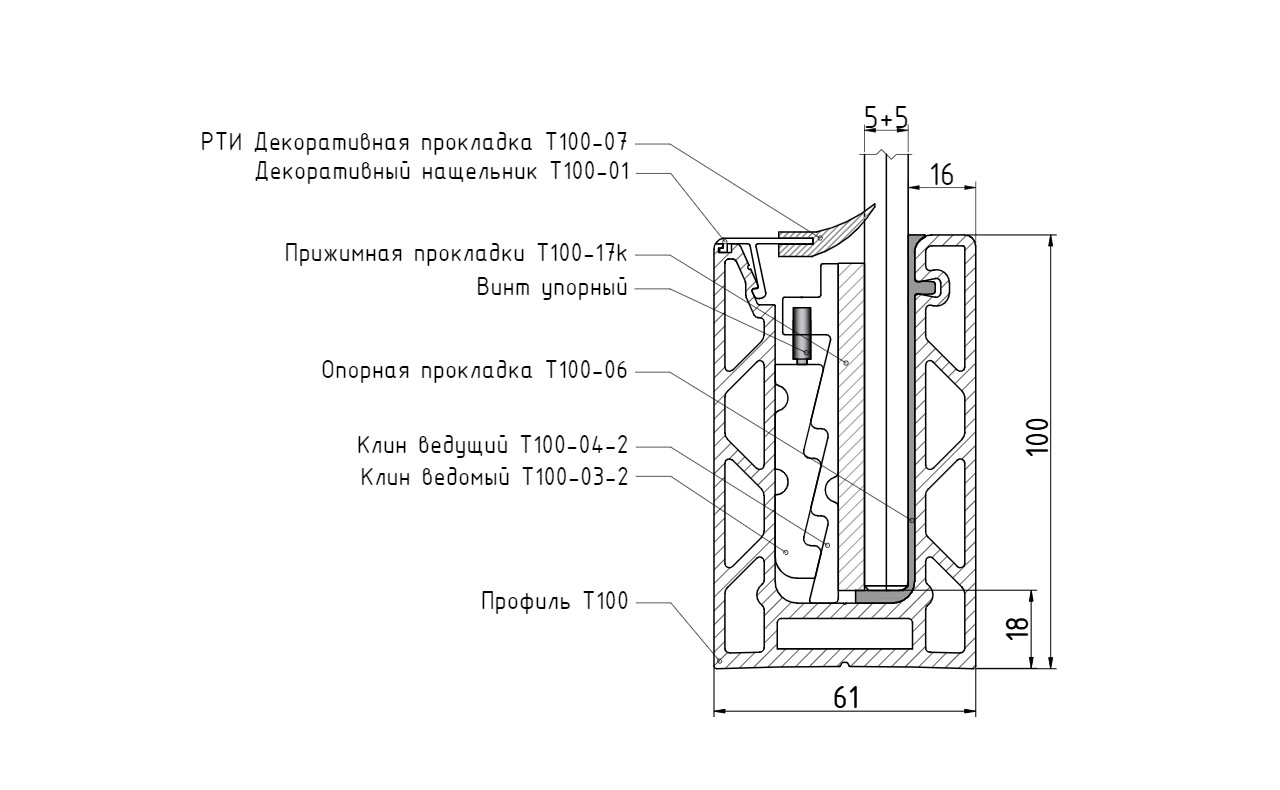 Системы зажимных алюминиевых профилей т100 предназначены для 8 типов размеров зажимаемых закаленных стекол: 10мм, 12мм, 16мм, 20мм, а также триплекса 5+5мм, 6+6мм, 8+8мм, 10+10мм
