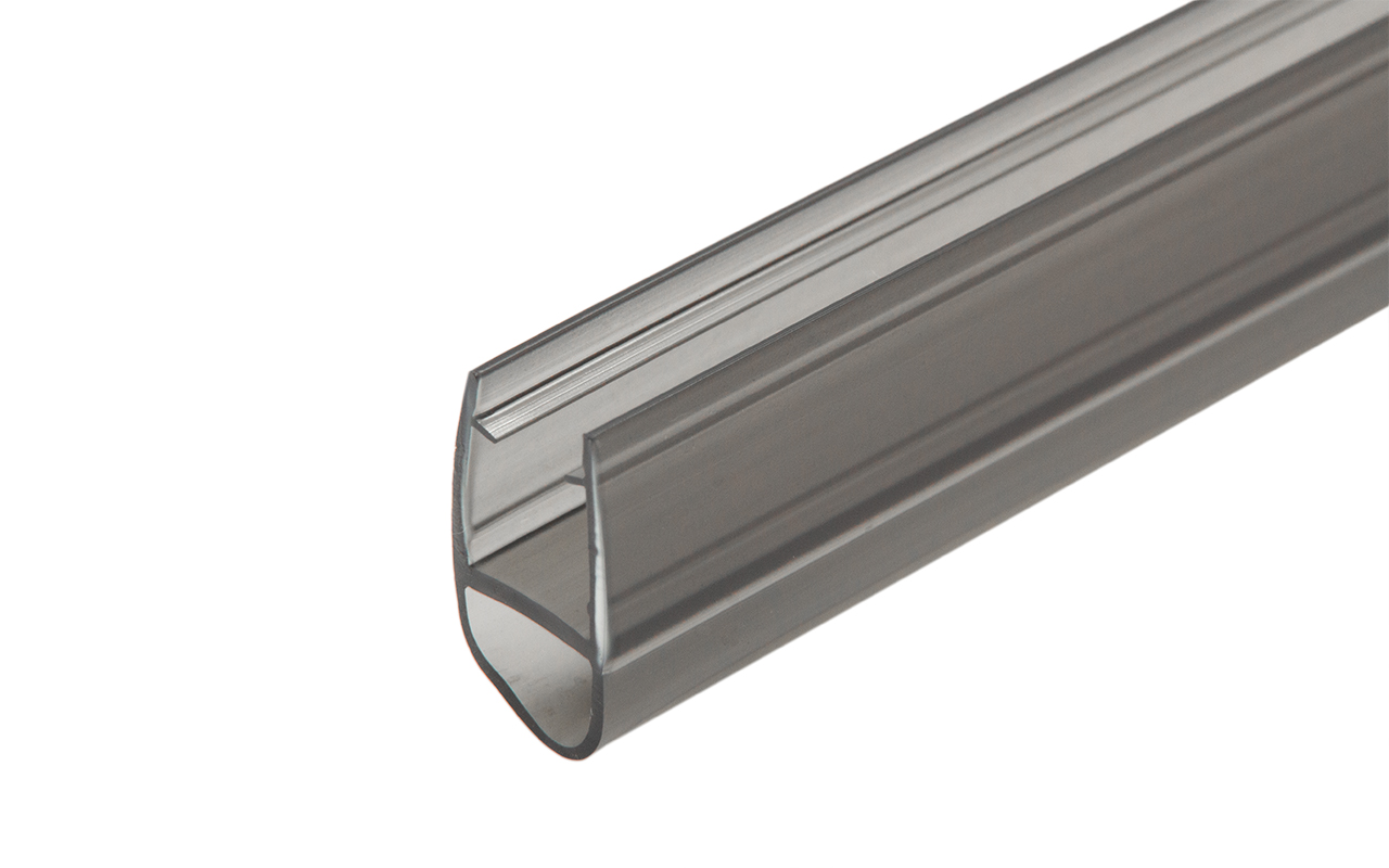 Уплотнитель имеет исполнение полупрозрачной черной поверхности, выполнен из материала ПВХ. Имеет A-образный профиль. Толщина одного типоразмера составляет 1,5 мм, длина – 2200 мм. За счет своих свойств (стойкость к щелочам, минеральным маслам и многим кислотам) прекрасно подходит для крепления стеклянного листа по всему периметру. Позволяет герметично соединять стеклянные панели с дверью, что гарантируют отсутствие течи в вертикальной части конструкции.