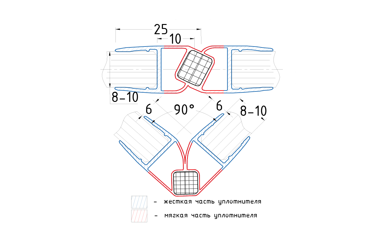 Комплект из двух профилей с магнитом. Монтируется по всему периметру стеклянного листа. Позволяет герметично соединять стеклянные панели между собой благодаря встроенному магниту. Толщина одного типоразмера составляет 1.5 мм, длина – 2200 мм. За счет своих свойств (стойкость к щелочам, минеральным маслам и многим кислотам) прекрасно подходит для крепления стеклянного листа по всему периметру. Применение этого комплекта гарантирует отсутствие течи в вертикальной части конструкции. Уплотнитель из комплекта применим в сочетании со стеклом толщиной до 8 мм и углом в плане до 90 и 180.