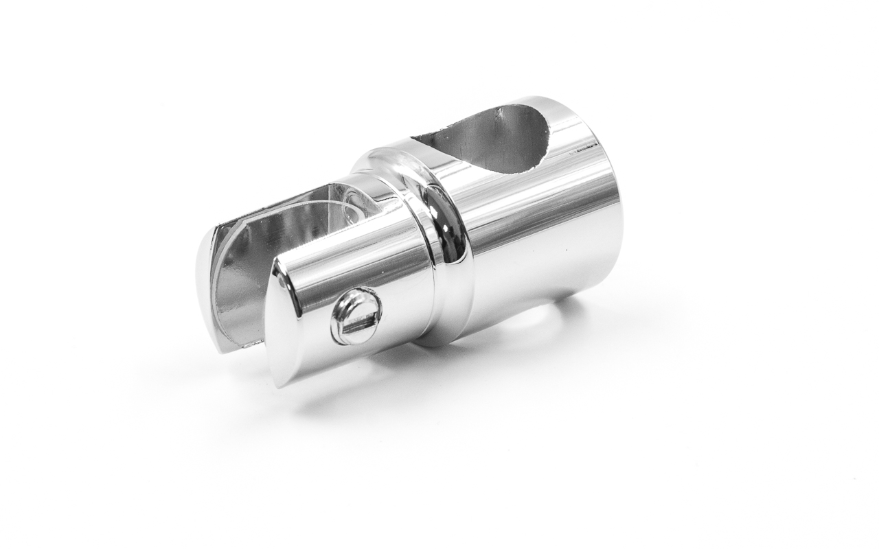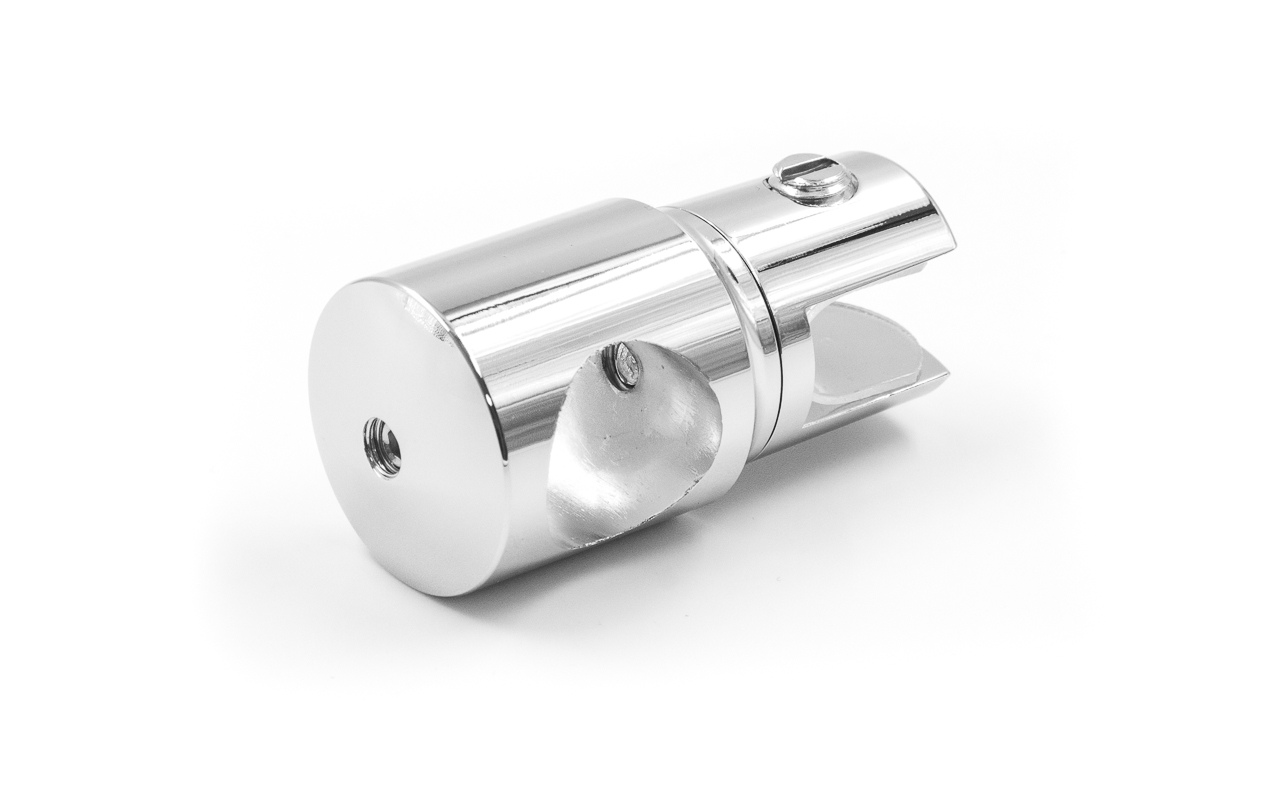 Крепежный элемент труба-стекло. Предназначен для соединения штанги в душевых кабинах со стеклом на любом участке штанги. Материал - цинк-хром, поверхность - полированная