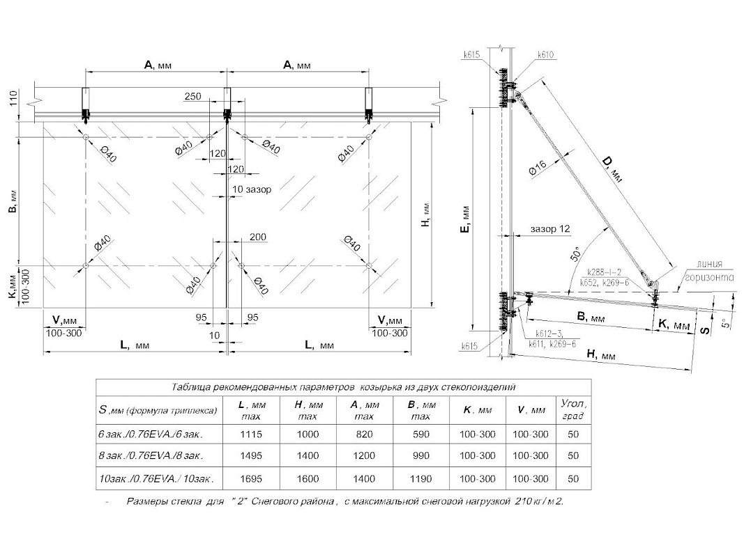 Применяется при монтаже козырьков из стекла, навесов над входом в магазин, козырьков над входом в подвал или над местом курения. Один из самых ответственных элементов крепления козырька. Отвечает за крепление конструкции непосредственно к зданию и несёт на себе весь её вес. Используется с рутелем k274-2либо k269-6.