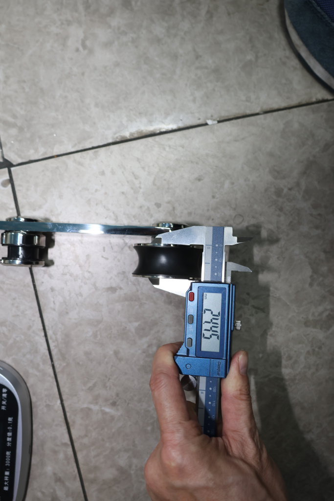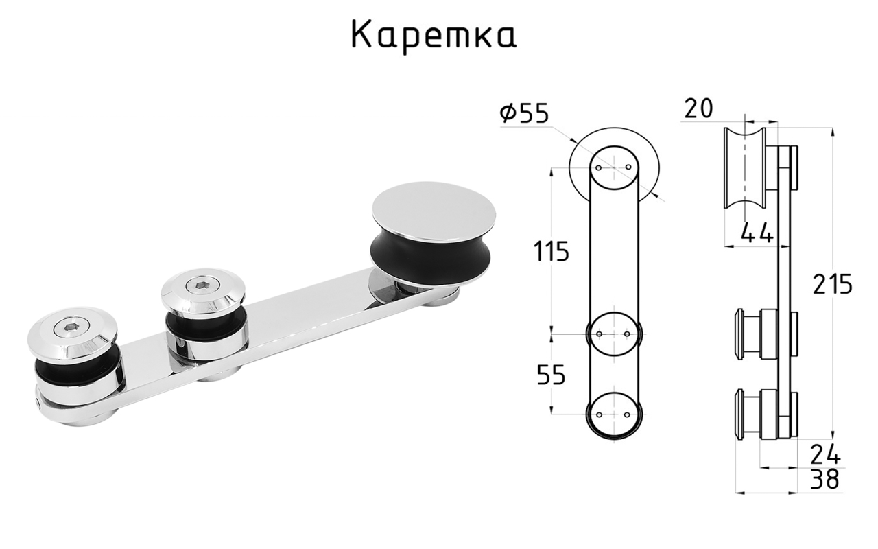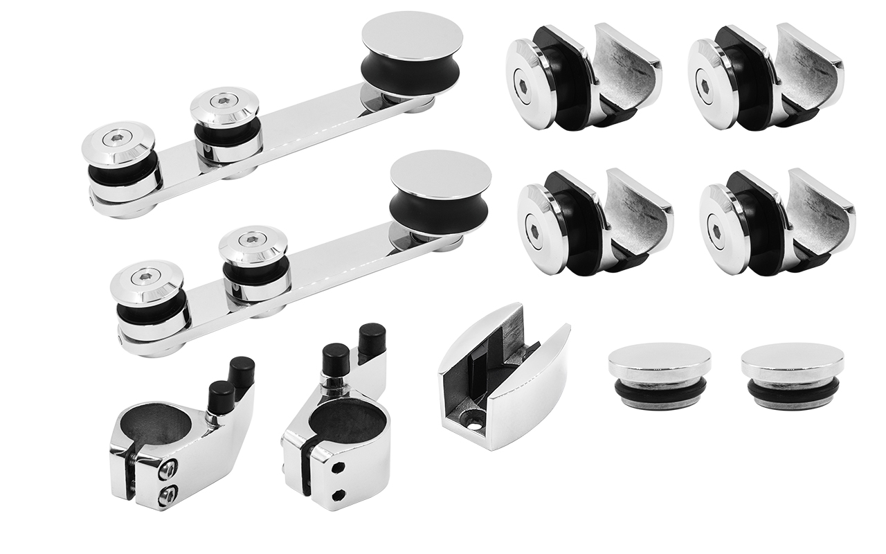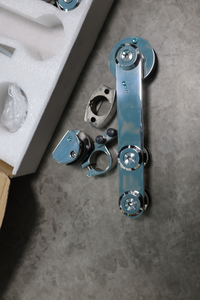 Комплект раздвижной системы для стеклянных дверей, марка стали- AISI 304, полированный. Максимальный вес двери на две каретки 80 кг.