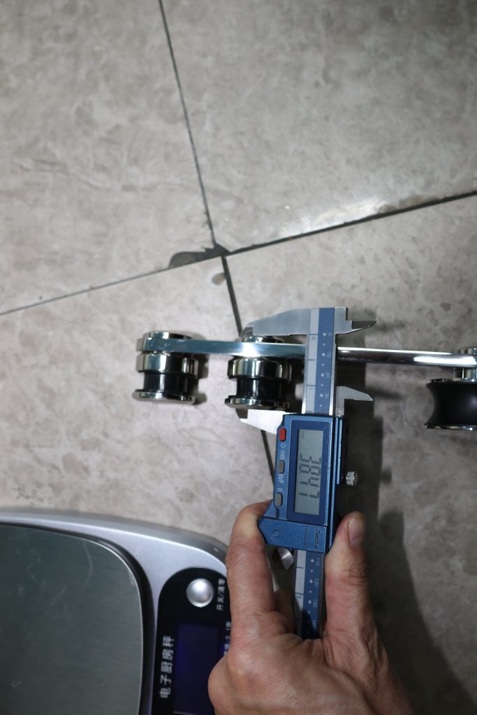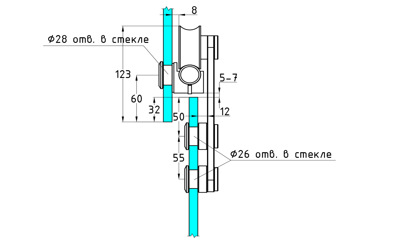 Толщина стекла лежит в диапазоне 10 -12 мм. В один комплект входит: каретка (2 шт.), крепление трека к стеклу (4 шт.), напольная направляющая двери (1 шт.), стопор для каретки (2 шт.), заглушка трека (2 шт.). На расчет расстояния между креплениями трека оказывают влияние: вес двери, ширина прохода, ширина стенового портала, высота неподвижного стекла, а также высота общая (от нижнего края фрамуги до пола).