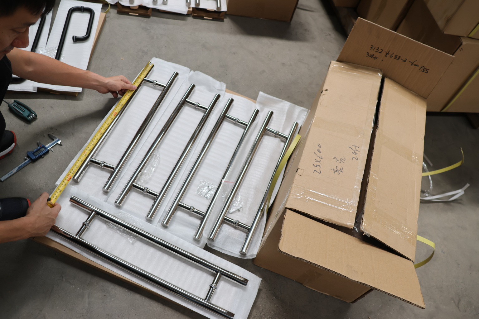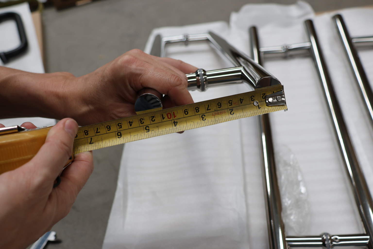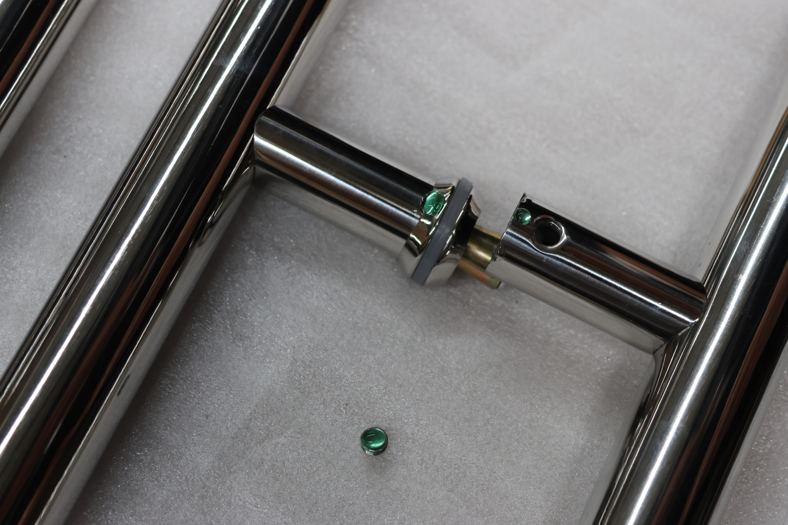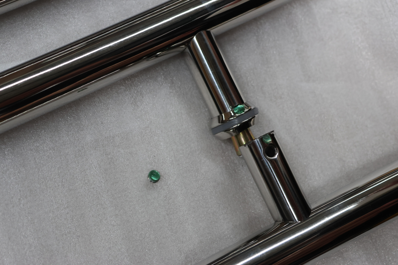 у основания ручки откручиваем с помощью шестигранника винты, делим ручку на две части, в заранее заготовленные отверстия вырезы в стекле 10-12 мм фиксируем первую часть ручки в отверстиях и с обратной стороны ответную часть затягиваем с помощью шестигранника