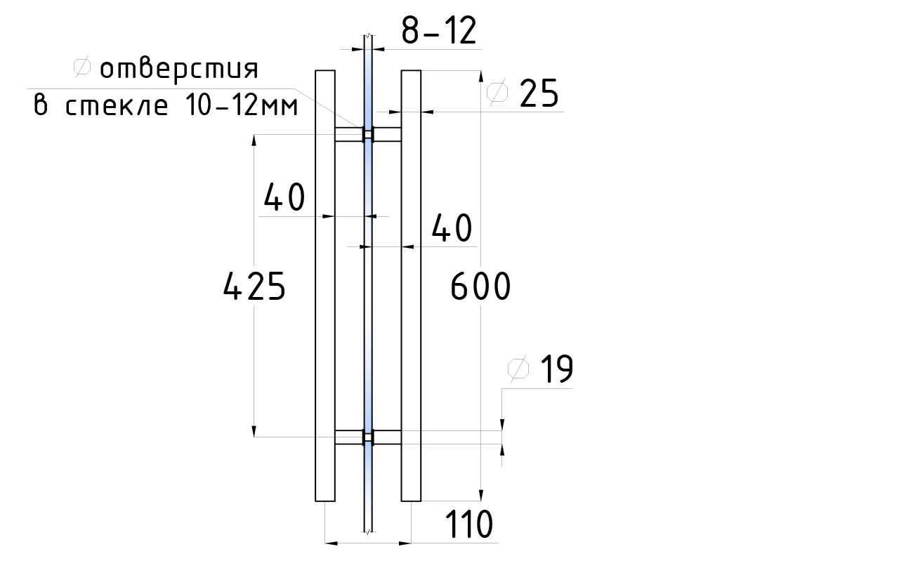Ручка для стеклянной двери рейлинг двухсторонняя для стекла 8-12 мм, 25х425х600 мм, полированная, марка стали- AISI 304