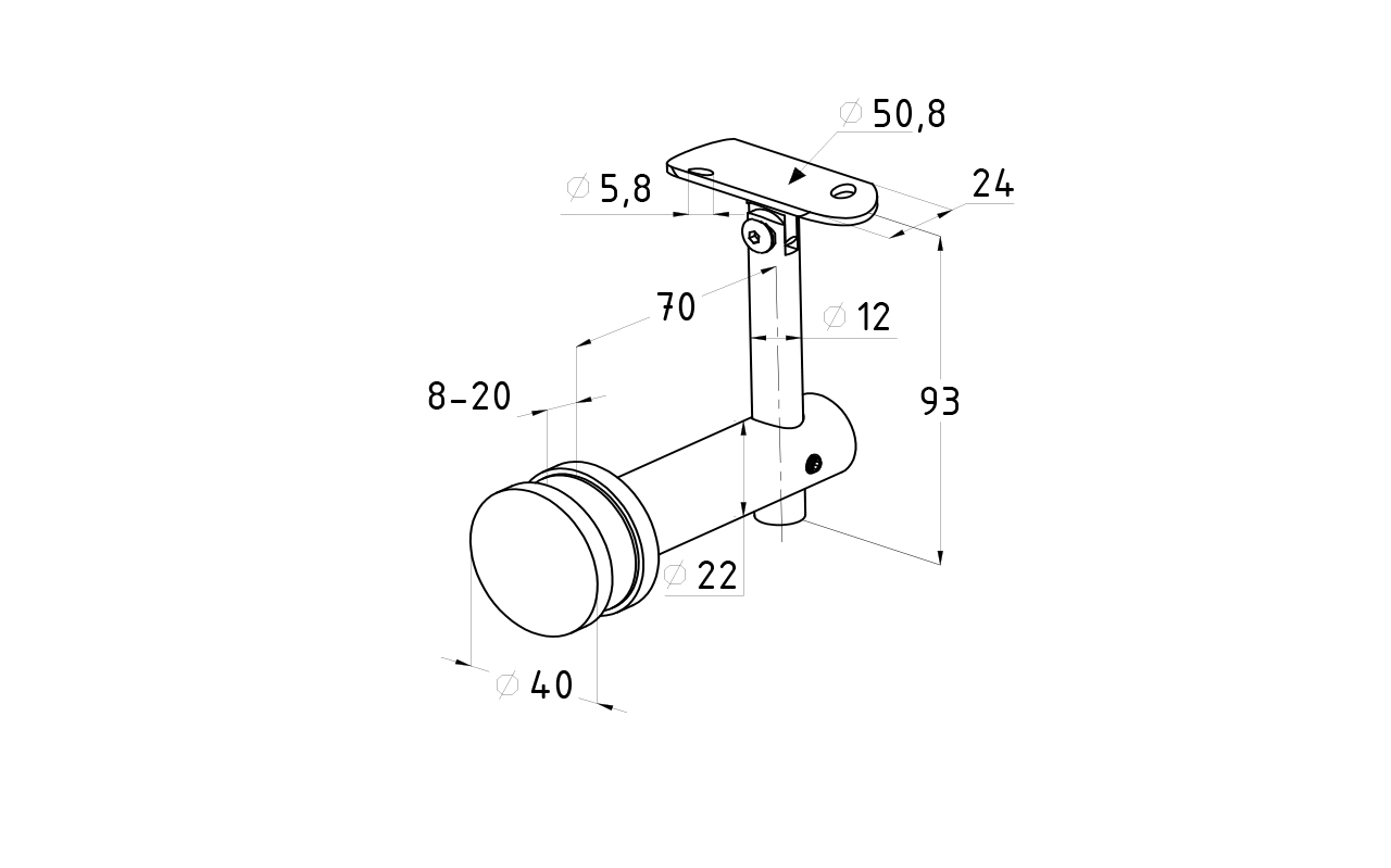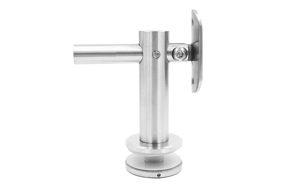 Выносной держатель поручня на стекло 8-20 мм. Деталь регулируемая, шлифованная, с ложементом под трубу Ø50.8 мм. Вырез в стекле Ø17-18 мм. Марка стали - AISI 304.