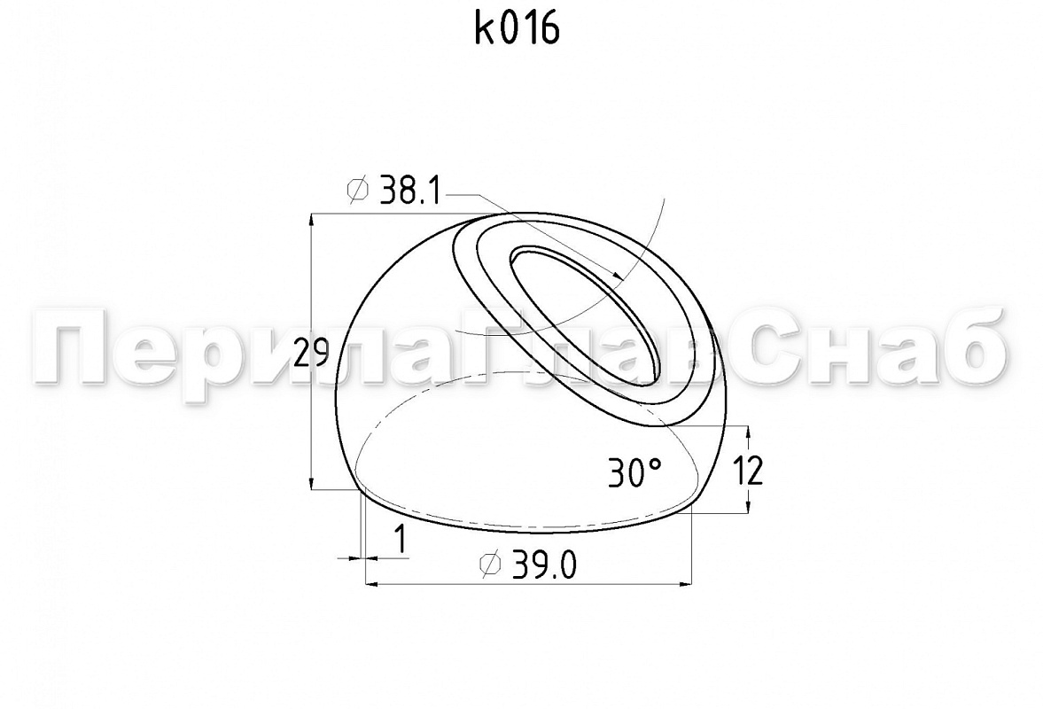 Наконечник штампованный (СПС) косой 30° на трубу Ø16 мм, для поручня Ø38.1 мм, полированный, нержавеющий, (AISI 201) k212-3