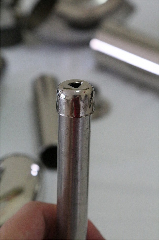 k211-3 наконечник стойки штампованный, прямой, Ø16 мм, для поручня Ø38.1 мм, полированный (aisi 201). Наконечник штампованный под 30°, на стойку Ø16 мм, для поручня Ø38.1 мм