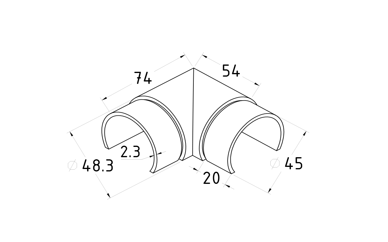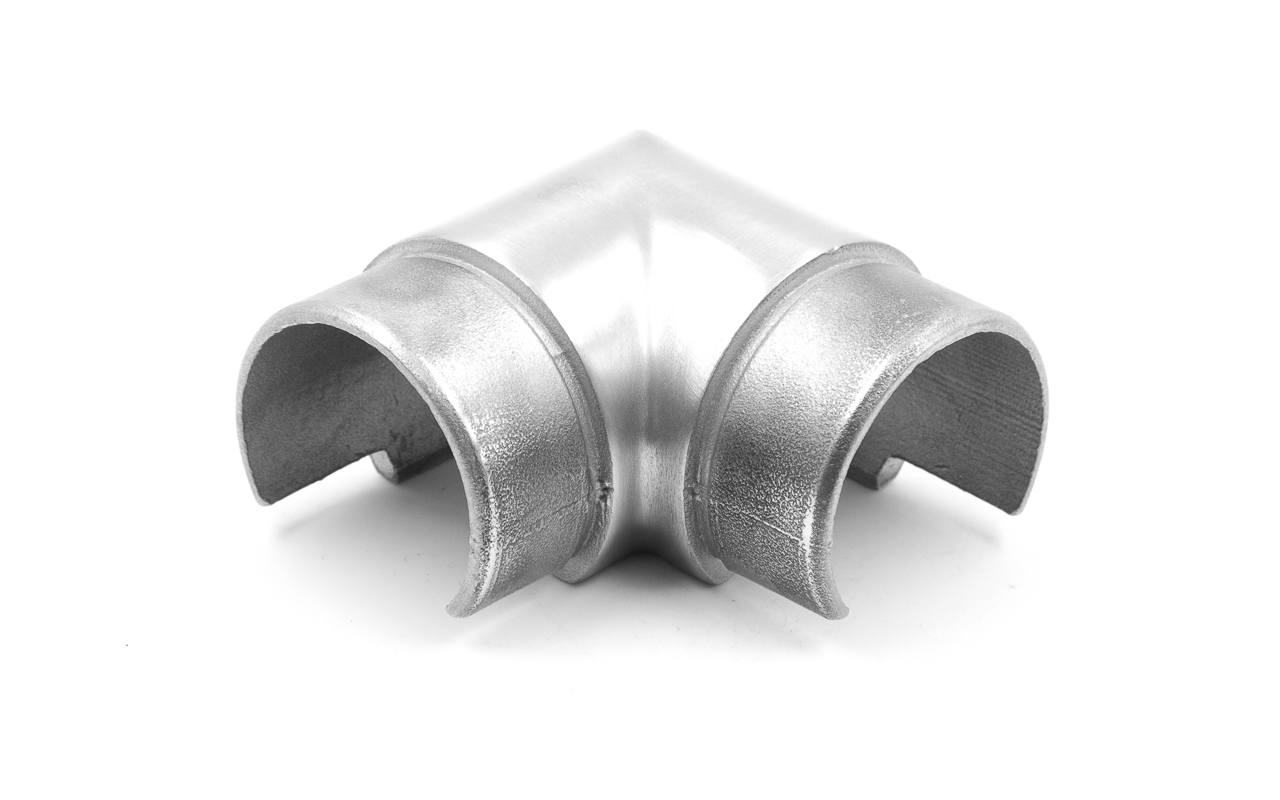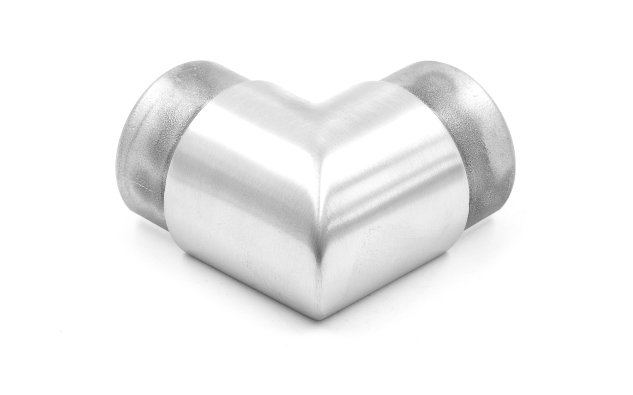 Фитинг предназначен для поворота поручня самосборных ограждений с несущим стеклом под углом 90 градусов в горизонтальной плоскости.