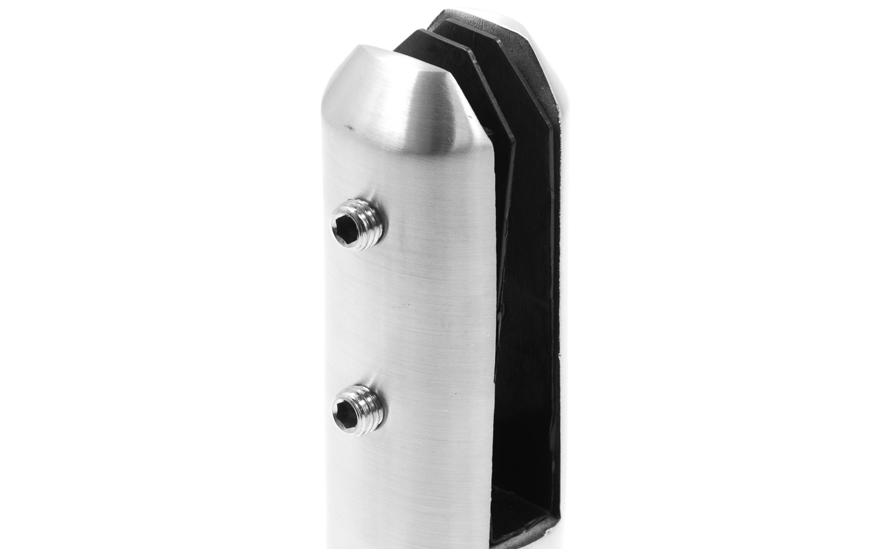Держатель крепится в пол на 4 анкера или шпильки. Для этого предусмотрено 4 отверстия диаметром 10-12 мм. Стекло просто зажимается в стеклодержатели с помощью двух фиксирующих винтов. Высота ограждения должна быть не более 1200 мм от пола. Если по проекту предусмотрен поручень, то мы рекомендуем использовать трубу с пазом прямоугольного сечения 60х40 (k824-4, k824-2, k824-5 ) или круглого сечения Ø48.3 мм ( k822-3) и Ø42.4 мм (k820-3 ). Кромку стекла также можно закрыть с помощью маленького п-образного профиля из нержавеющей стали ф-0454 и ф-0455.
