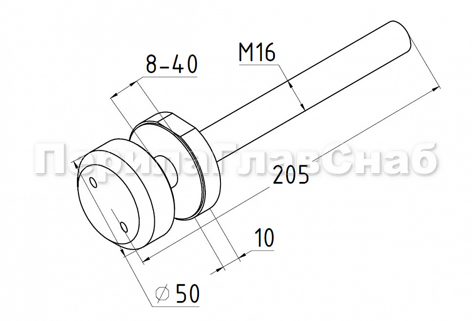 Стеклодержатель Ø50х10х18, шпилька М16х205 мм, для стекла 8-40 мм, с возможностью регулировки выноса до 65 мм, для торцевого крепления стекла, шлифованный, литой, точечный.