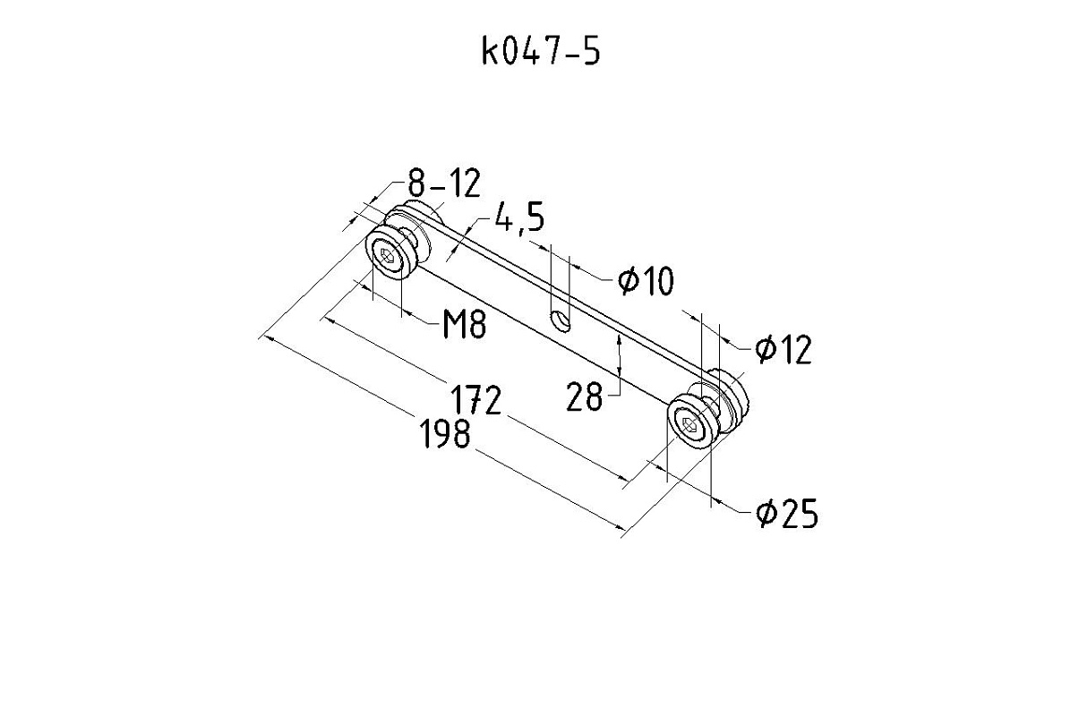 Стеклодержатель пластинчатый штампованный (толщ. 5 мм, ширина 30 мм), полированный, 3 отверстия М8, по центрам 85+85 мм=170 мм. В комплекте 2 штампованные шайбы 25х4х0.5 мм, 2 винта М8, предназначены для стекла 6-12 мм. Для более толстого стекла нужно докупать более длинные винты М8. Пластиковые втулки k503для стекла в комплект не входят. Наличие наклонных маршей или поворотов не является припятствием для применения пластинчатых стеклодержателей. А вот стекло нужно подготовить - сделать заранее отверстия под винты стеклодержателя. Благодаря более четкой и жесткой фиксации стекла в пластинчатых стеклодержателях, исключается риск выпадения стекла, как это может произойти в случае применения зажимных стеклодержателяей.