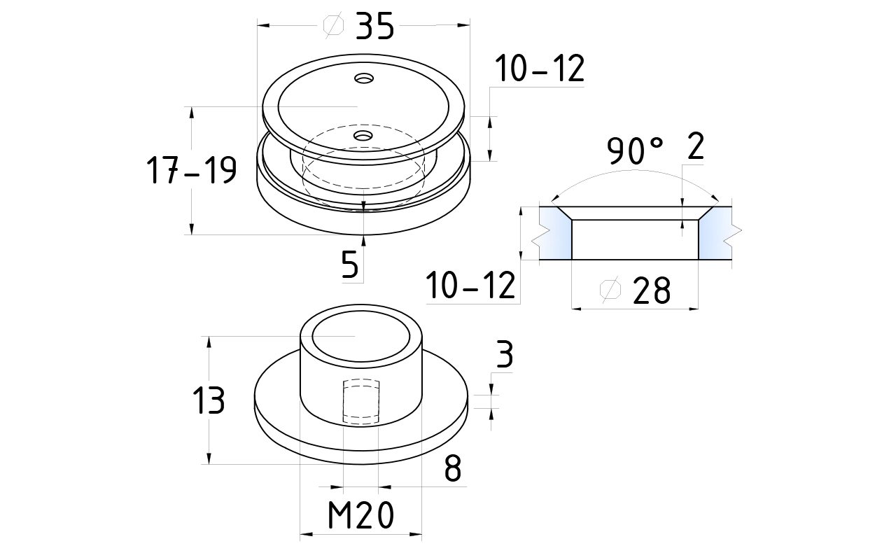 Точечный стеклодержатель для стеклянных стен. Вылет от стены 8.5-10.5 мм, для крепления используется шпилька М8.
