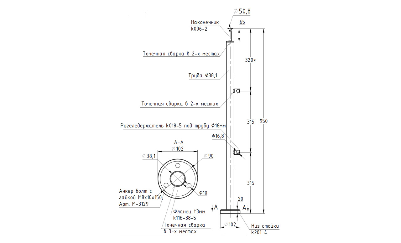 Стойка изготовлена на нашем производстве и готова к установке сразу после покупки. Используемая при изготовлении 304 марка стали позволяет применять данную стойку как внутри здания, так и на улице. Особенно это важно для людей, которым важно сделать свои ограждения в одном стиле как внутри здания, так и снаружи. Все элементы стойки приварены аргонной сваркой, благодаря чему фланец с 3-мя отверстиями для крепления в пол, ригеледержатели под трубу ф16мм и наконечник под трубу ф38-50 составляют единую конструкцию со стойкой. Сварные швы на балясине убраны и идеально заполированы,а балясина ничем не уступает ограждениям сделанным профессиональными бригадами. Любой человек сможет сделать монтаж имея только отвертку, клей( ф-1127, ф-1105) и саморезы( М-3850, М-3847, М-3215)