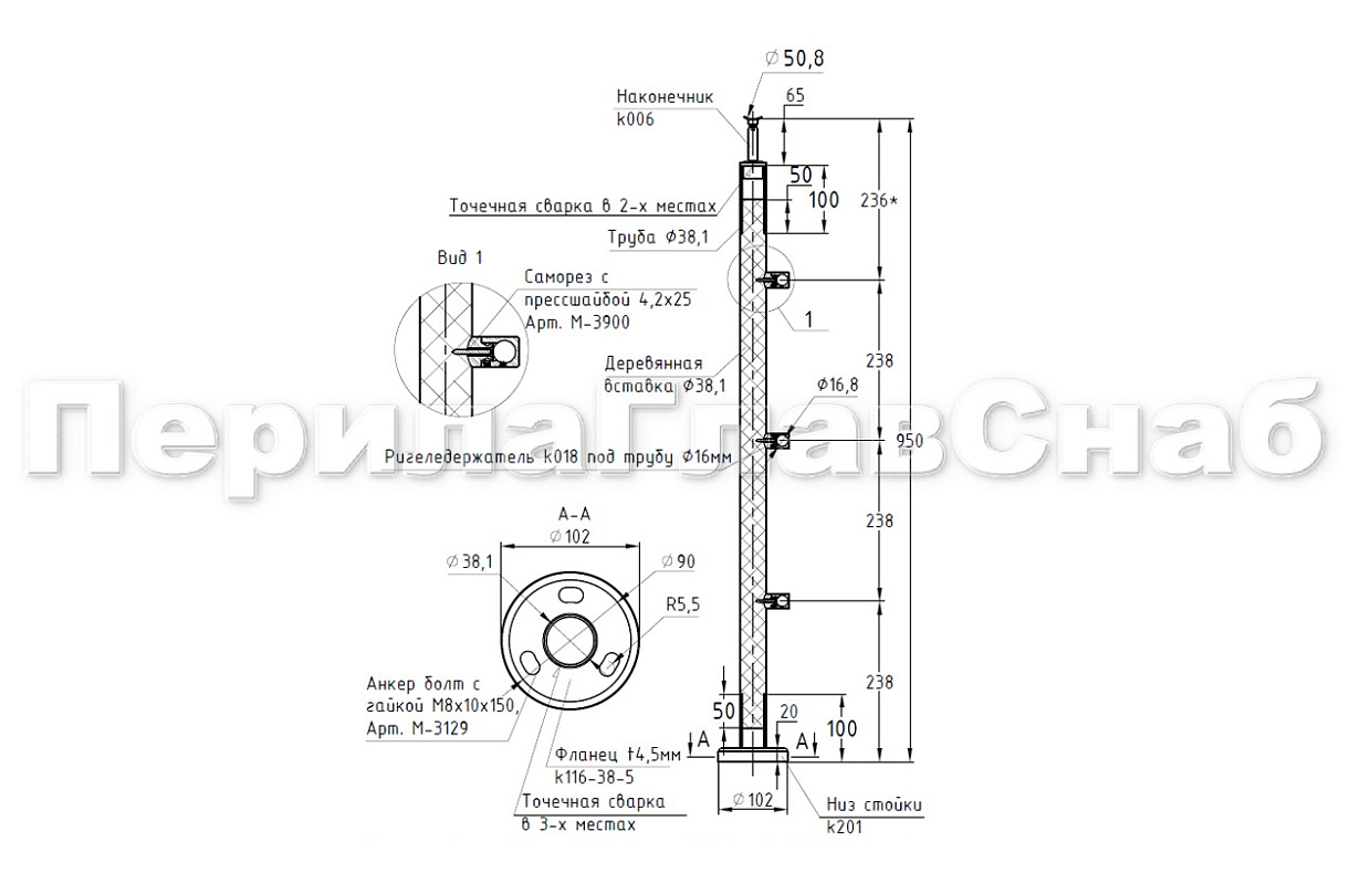 Готовая стойка Ø38,1 мм, с фланцем и наконечником, высота 950 мм, полированная (AISI 304) k702 купить в Новосибирске