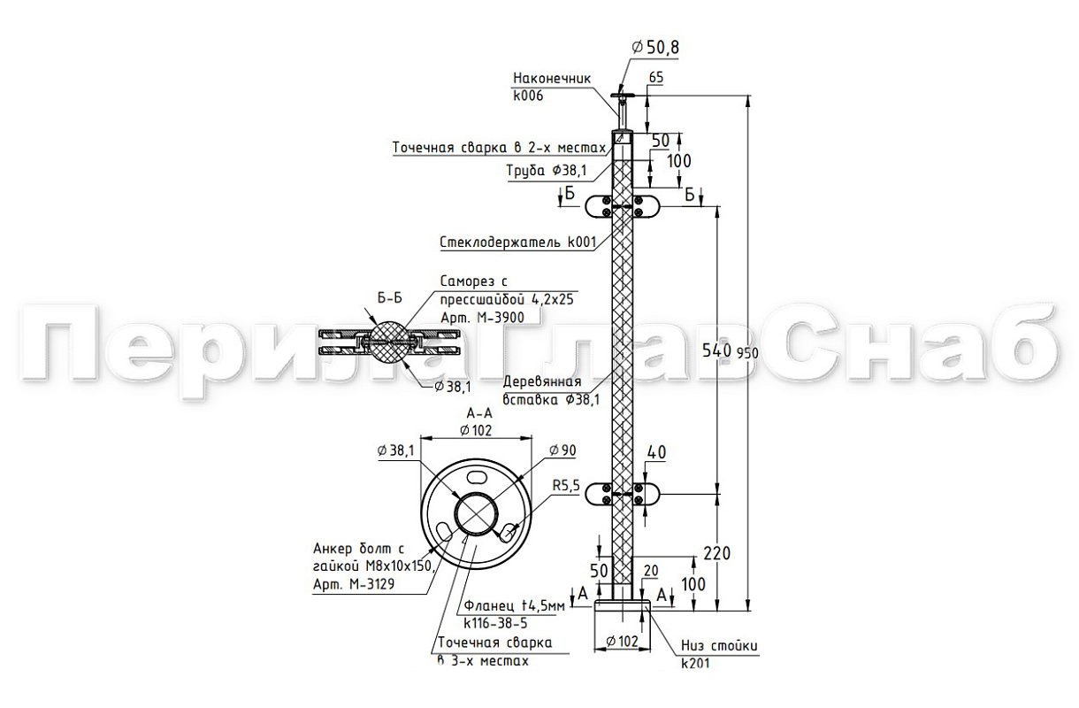 Готовая стойка Ø38,1 мм, с фланцем и наконечником, высота 950 мм, полированная (AISI 304) k702 купить в Новосибирске