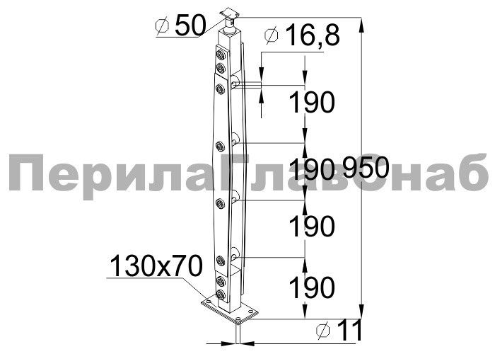 Готовая стойка 40х40х950 мм, деревянная, со вставками из нержавеющей стали 2х100 мм с 3 ригеледержателями k740-1-G