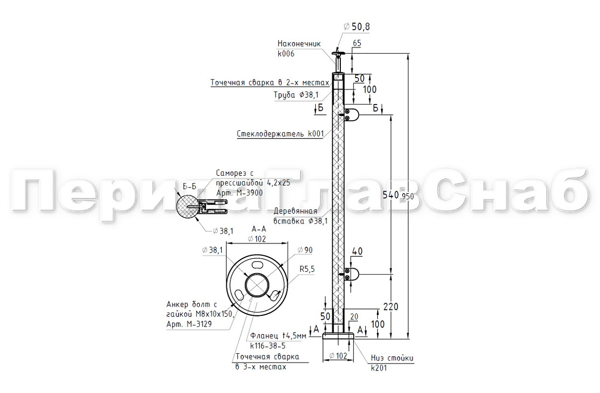 Готовая стойка Ø38,1 мм, с фланцем и наконечником, высота 950 мм, полированная (AISI 304) k702 купить в Новосибирске