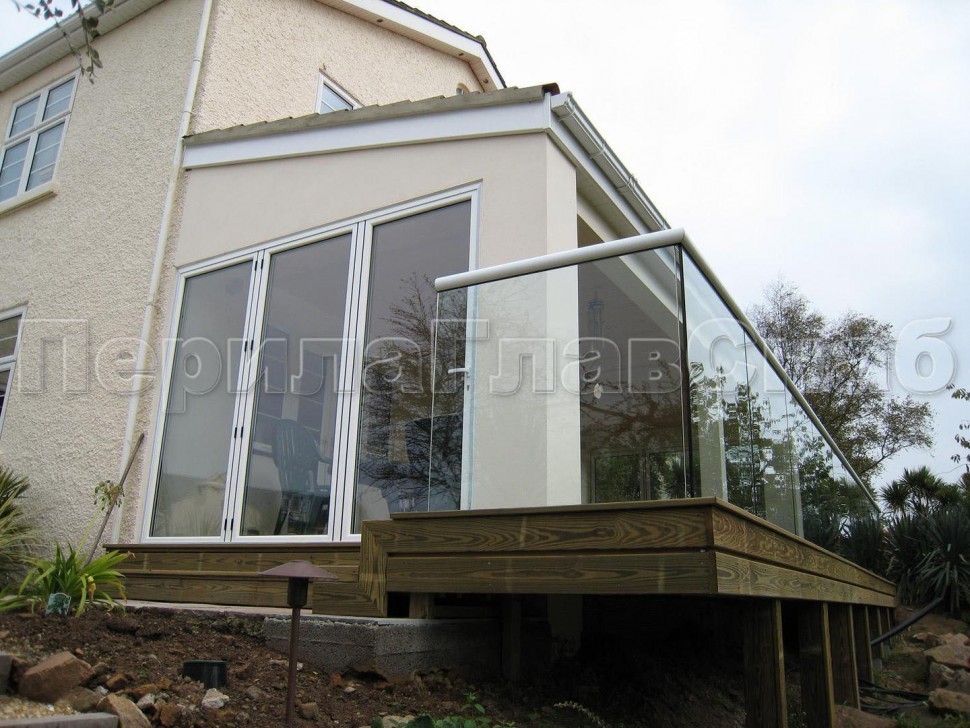 Ограждение с деревянным поручнем с зажимными стеклодержателями и стойками