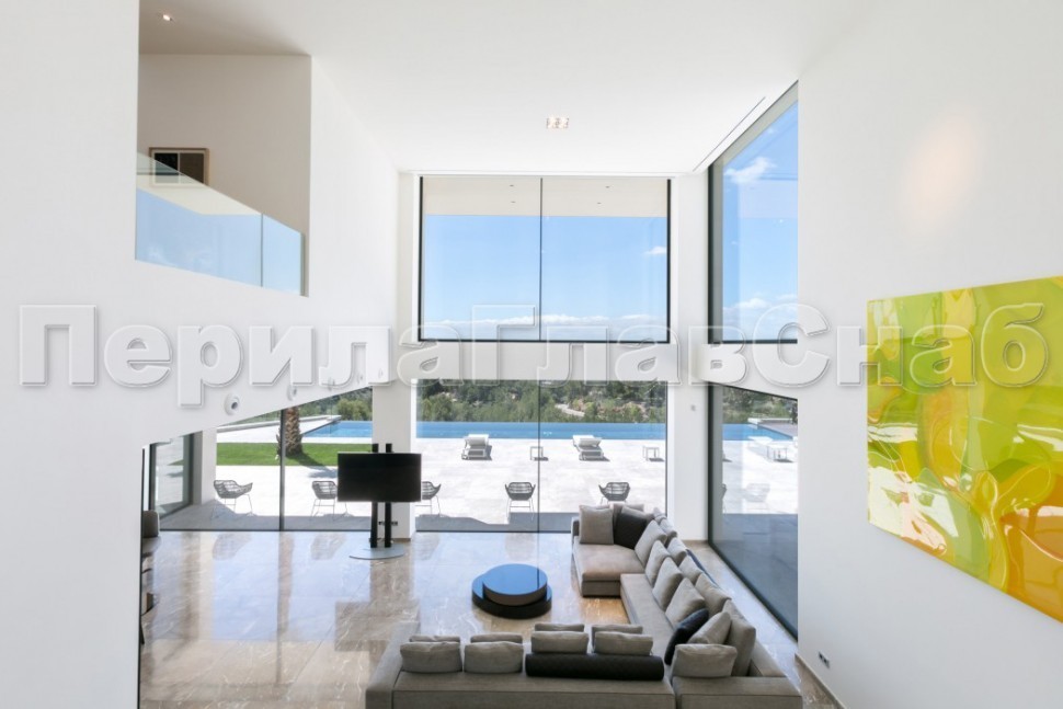 Несущее стекло крепится на алюминиевый профиль. Профиль изготовлен из полированного (зеркального) анодированного алюминия. Крепления профиля к плите основания осуществляется в торец. В целом, конструкция таких перил очень надежная.