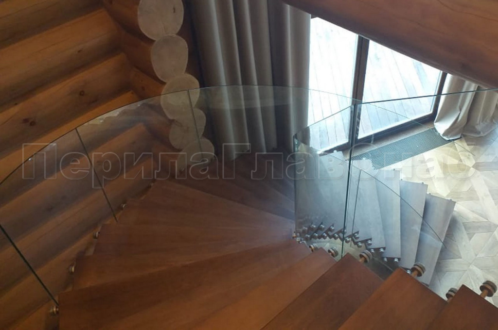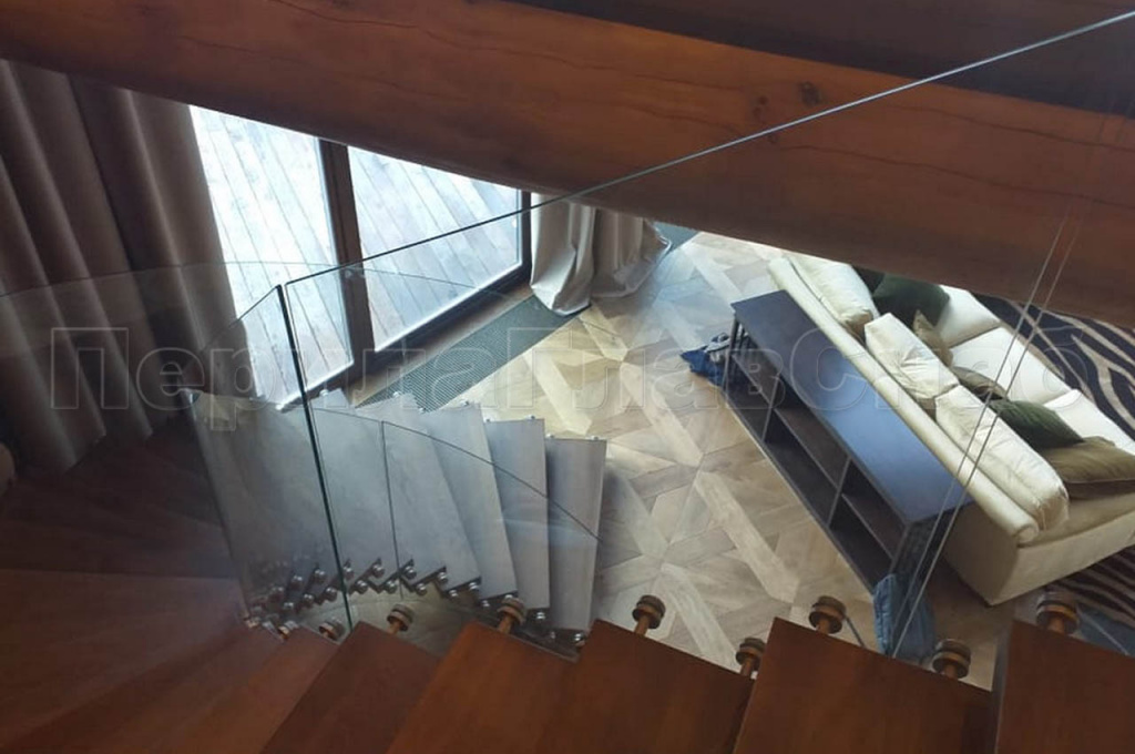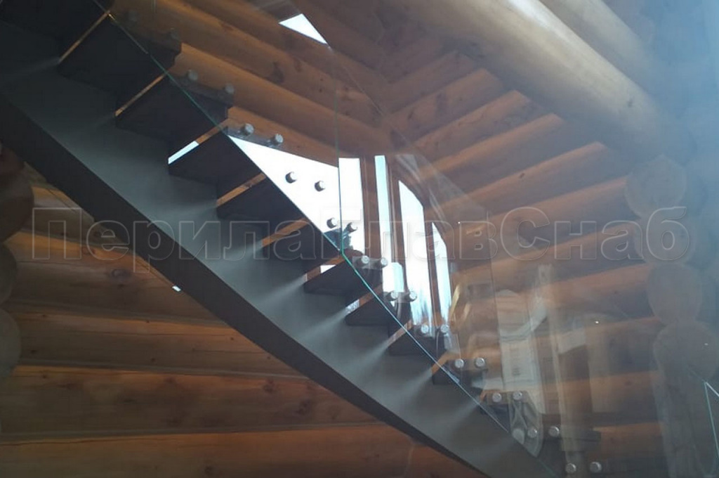 Изготовление лестницы для частного дома на территории коттеджного поселка «Madisom Park». Клиент обратился в компанию с просьбой изготовить лестницу вместо установленной временной конструкции. Изготовление предполагалось на тетивах  по винту с силовыми площадками под деревянные ступени. На руках  у заказчика был дизайн проект дома, под который подгонялись все цветовые решения и особенности конструкции лестницы. Инженерами нашей компании был предложен  вариант изготовления лестницы на ломанном моно косоуре по винту, для того чтобы добиться визуального эффекта легкости  всей лестницы. Это решение усложняло процесс изготовления лестницы из-за появления дополнительных элементов силовой конструкции.  Финалом многочисленных согласований с заказчиком стала лестница из черного металла с силовым элементом из трубы 100х100х4 мм и ребрами 60х40х4 мм с обшивкой листовым металлом 2 мм для скрытия силовых элементов, с последующей грунтовкой и покраской на объекте. Цвет изделия подбирался индивидуально к этому проекту т.к. оттенок, который нравился заказчику не присутствовал  в известных каталогах RAL, колеровка цвета  подбиралась по образцу. Так как дом сделан из бруса и со временем должен давать усадку, было принято решение моно косоур сделать регулируемым относительно второго этажа площадки дома. Следующий этап изготовление, монтаж и установка ступеней. Конструктив ограждения: радиусное (молированное) несущее стекло на точках толщиной 12 мм. Установка на точечный держатель на базе К277 внешняя декоративная накладка покрашена порошковой краской по каталогу RAL. Основные сложности радиусного несущего стекла. Технология производства зависит от радиуса лестницы, чем он меньше, тем сложнее. В этом проекте как раз и был малый радиус. А так же разработка чертежей подготовленных специалистами компании.