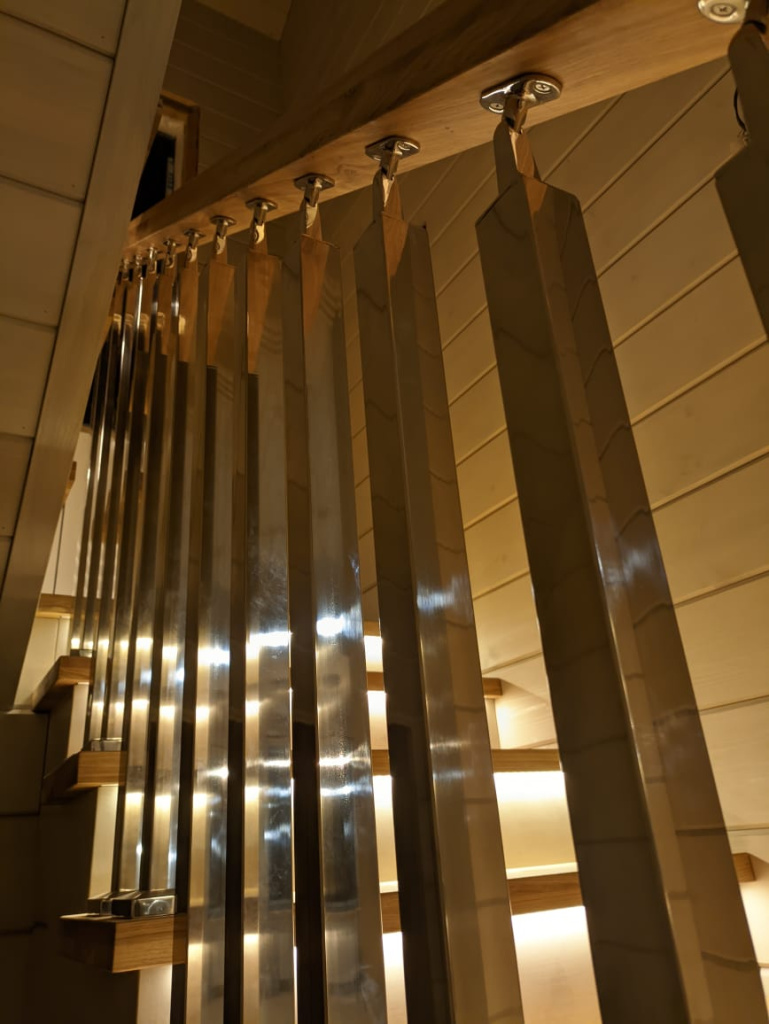 Одной из ключевых особенностей проекта является сочетание нержавеющей стали и дерева дуба.