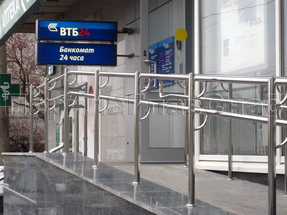 У входа в здание банка была установлена система из пандуса для инвалидов и многоуровневые поручни из нержавеющей стали поверх гранитного парапета. Характерной особенностью конструкции являлось настоятельное требование со стороны заказчика не использовать заполнение между стойками в виде традиционных ригелей, оставляя и даже нарочито подчеркивая перила и стойки ограждения, дабы вид сверкающей нержавейки не затмевал основание, покоящееся на облицовке благородной плиткой натурального гранита.