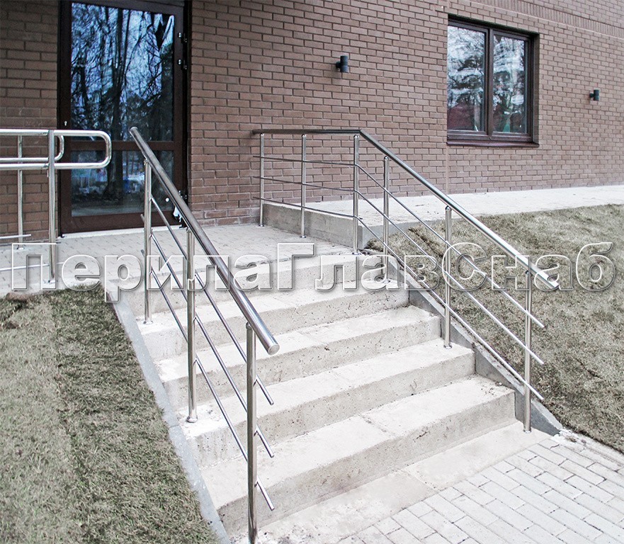 Ограждения для пандусом со сдвоенным поручнем ( выносное крепления для верхнего и нижнего поручня) и с ригелем для увеличения жесткости конструкции. Ограждение пандусов полностью соответствует ГОСТ.