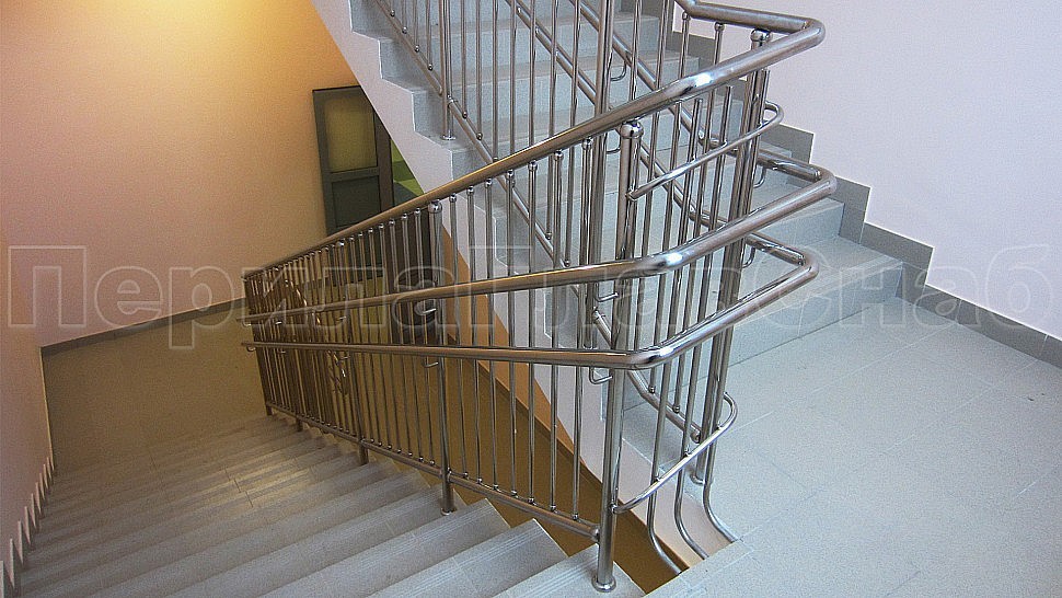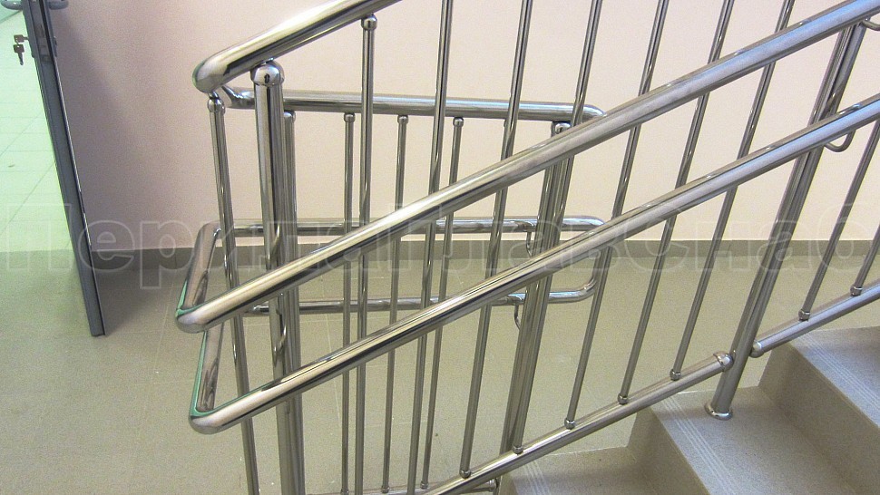 • У лестницы же стойки имеют высоту чуть большую — 950 мм, труба Ø38 мм. Устанавливаются на расстояние через две ступени в третью, на прямых участках не более 1000 мм друг от друга. Наконечник выполнен в декоративном стиле в виде сферы. Для большей безопасности установлены семь ригелей между стойками, и, в отличие от пандуса, они крепятся к стойке сваркой снизу и установлены вертикально. Поручень двойной диаметром 38 мм установлен на высоте 700 мм и 900 мм, крепится к стойке на выносных держателях и на поворотах завязан бубликом.
