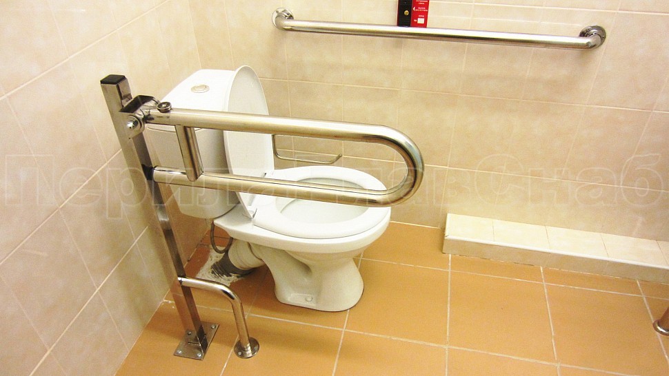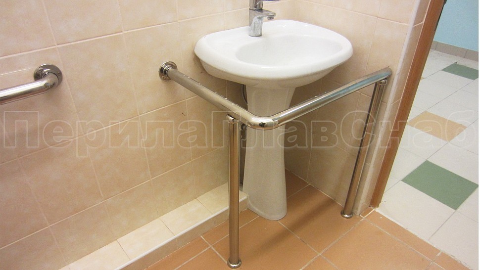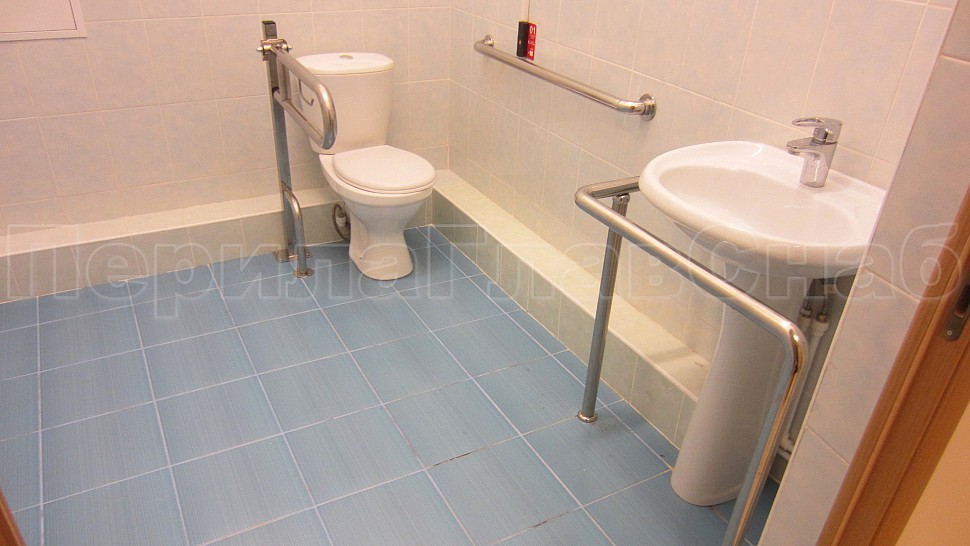 3. Также были установлены поручни в ванную комнату и туалет для маломобильных групп населения: труба диаметром 38 мм, установлена на боковых крепежах к стене, на стойке с выходом в пол у раковины, и на квадратной стойке возле туалета.