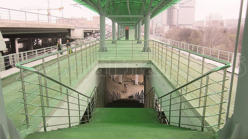 Компание ПерилаГлавСнаб были установленны отбойники на витражи из полированной нержавеющей стали. Труба диаметром 50мм устанавливается в два ряда на высоте 900мм и 1000мм и крепится к вертикальному импосту витража на саморезы через фланцы, изготовленные из листа 1,5мм. Гнутые выносные элементы из прутка 10мм привариваются к фланцам и трубе, сама труба завязана на поворотакх, ее окончание исполнено в форме “бублик”. Крепление нержавеющих элементов между собой произведено при помощи аргонно-дуговой сварки, с последующей зачисткой и полировкой.