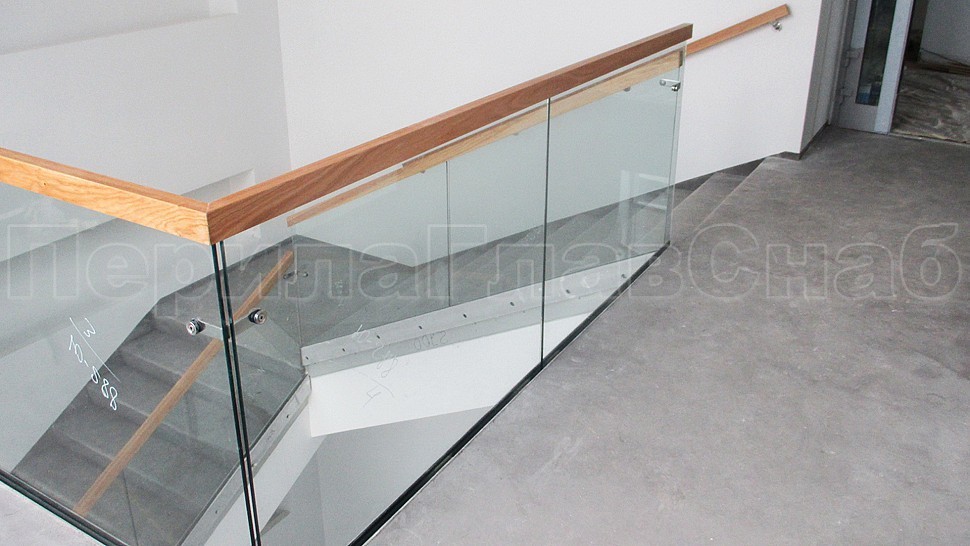 Лучшим решением в оформлении лестницы являются перила комбинированного вида. Такой заказ поступил к нам в компанию. Сочетание металла, дерева, стекла, которые обладают прекрасными декоративными свойствами. Они имеют высокую прочность и обеспечивают гармоничное вхождение в любой интерьер административного здания. Ограждение колодезной лестницы и площадок с прозрачным закаленным 10 мм стеклом и полировкой кромки по периметру с креплением в торец ступеней на нижнем зажимном алюминиевом профиле высотой 114 мм и шириной 44 мм. Высота ограждения с поручнем на стекле сверху 950 мм. Поручень дубовый клееный из сегментов сечением 40х60 мм с тонировкой в RAL и покрытый лаком. На поворотах поручень обрывается, между двух стекол в верхней части угловой соединитель из нержавеющей стали. На алюминиевый профиль с торца крепится накладка из полированной нержавеющей стали 1 мм.