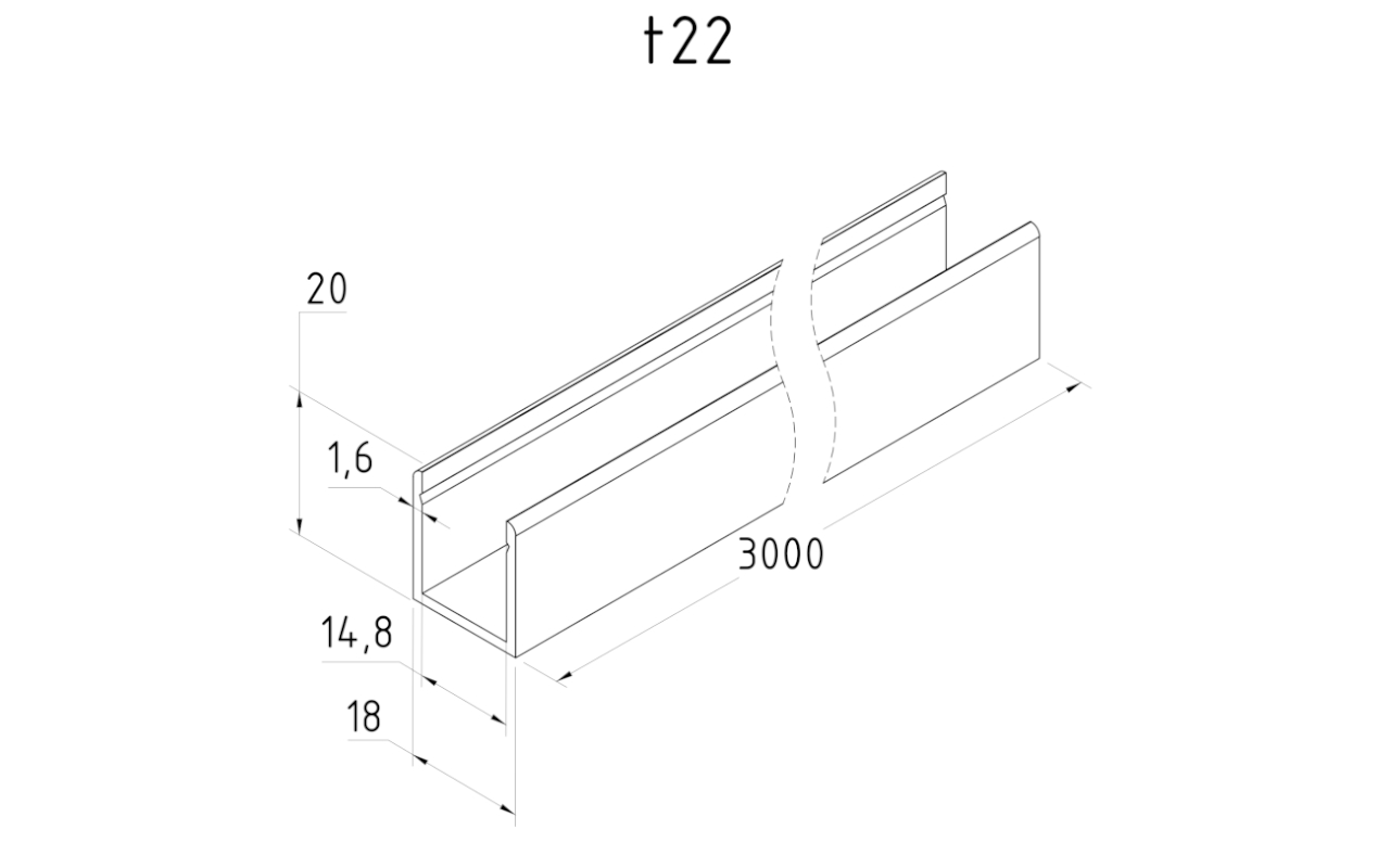 высота 20 мм, ширина - 18 мм, толщина стенки - 1.6 мм, длина 3000 мм