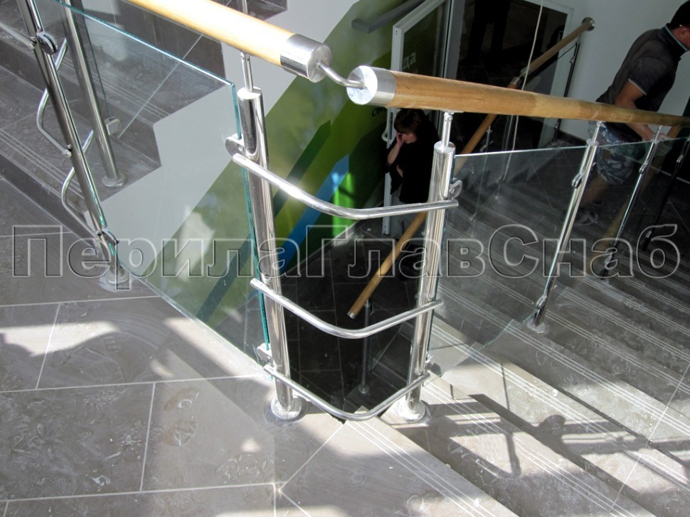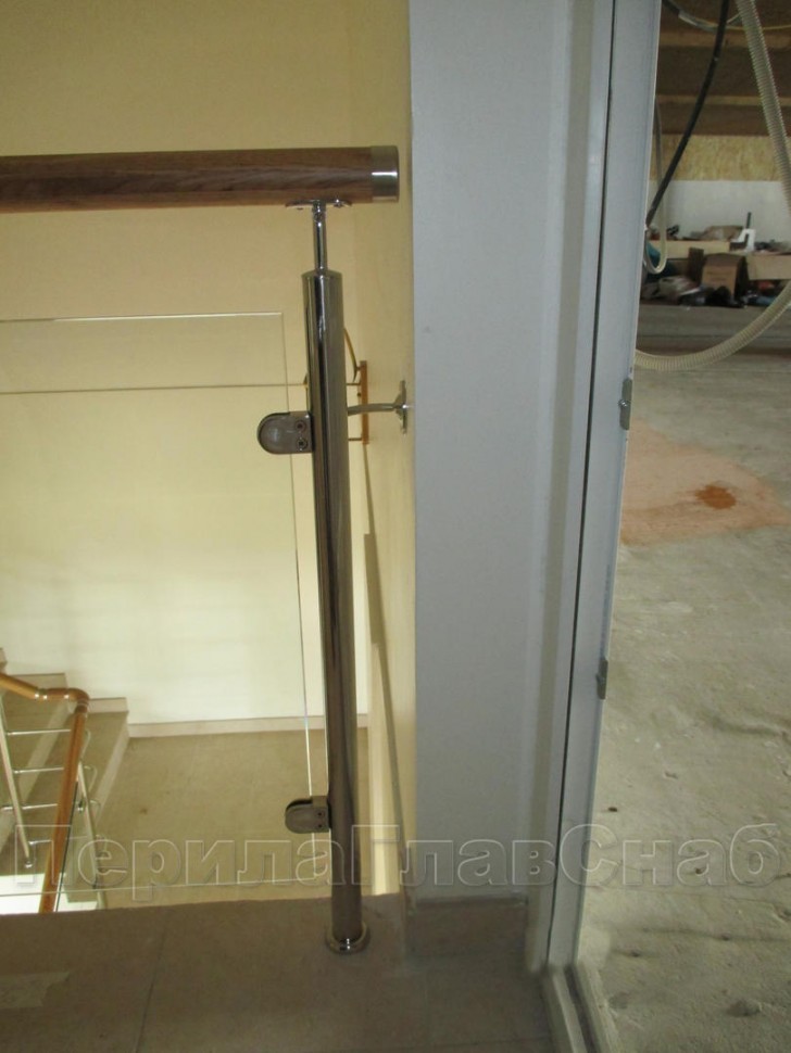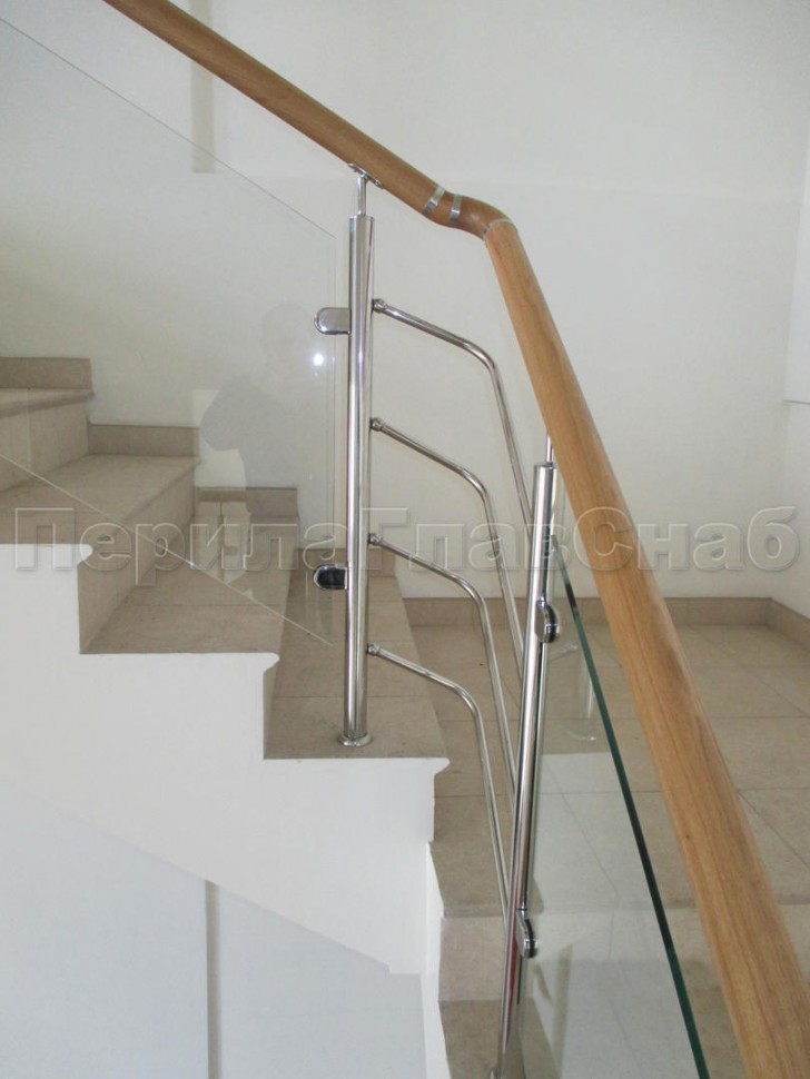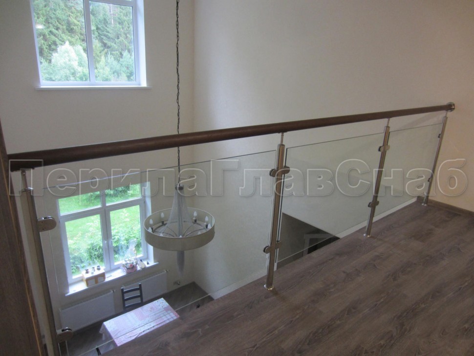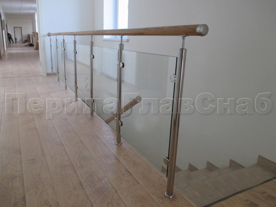 Ограждение с круглым деревянным поручнем с зажимными стеклодержателями и стойками с деревянными вставками
