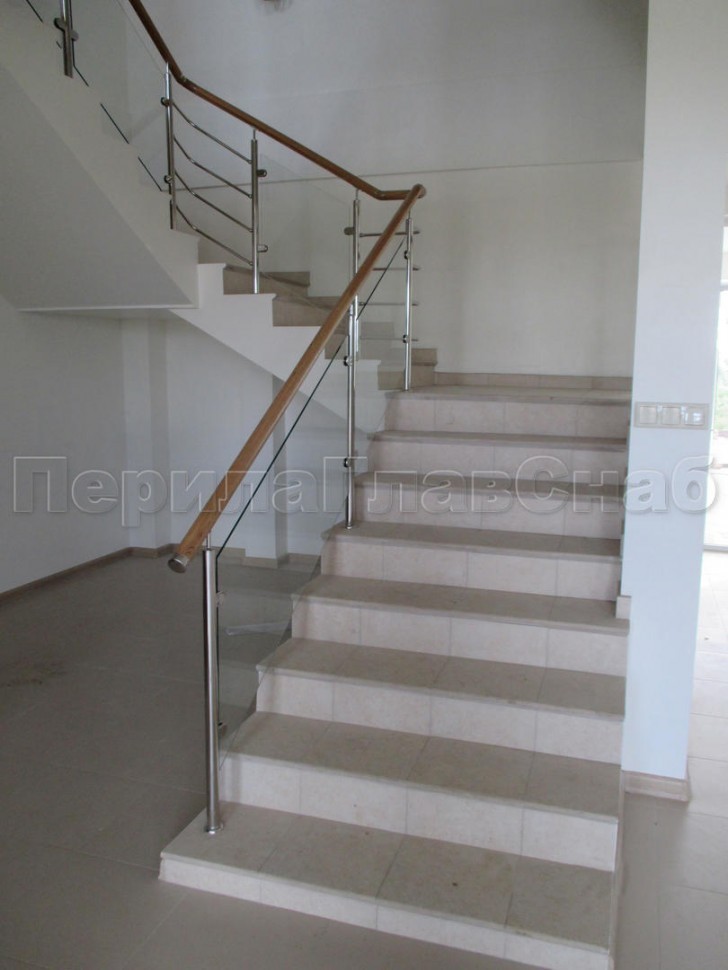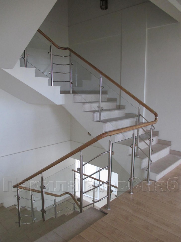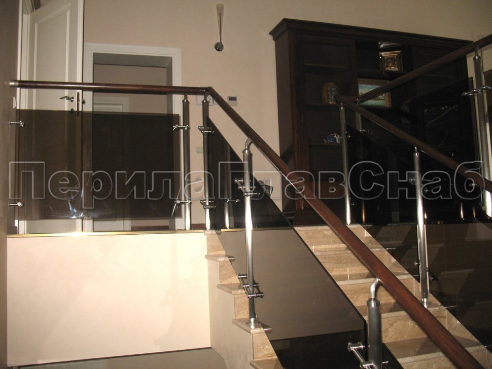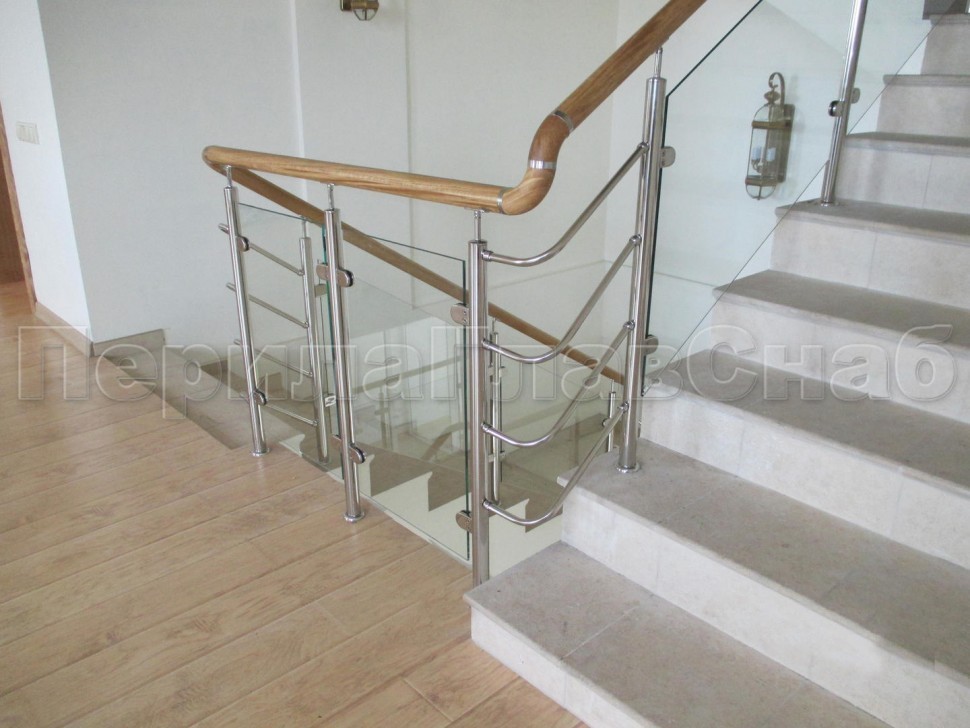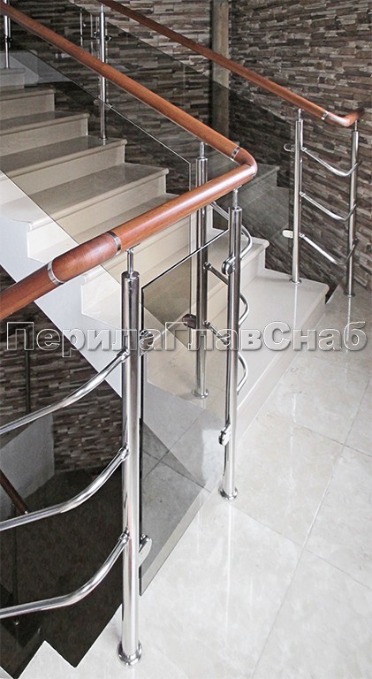 Ограждение с круглым деревянным поручнем с зажимными стеклодержателями и стойками с деревянными вставками