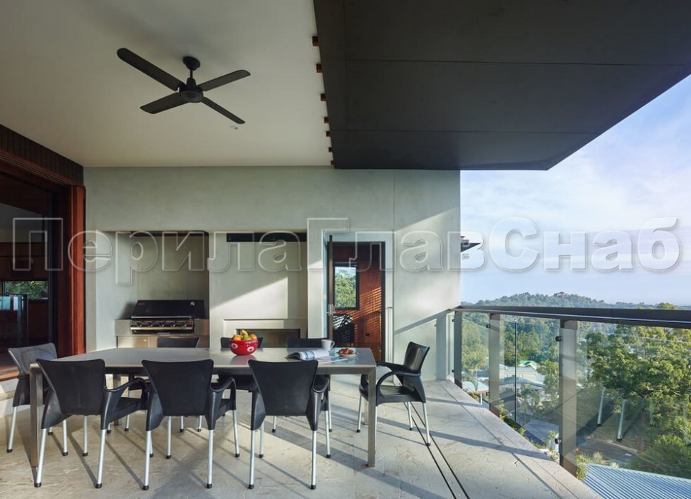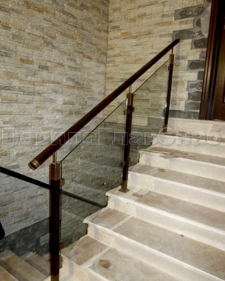 Ограждение с деревянным поручнем с зажимными стеклодержателями и стойками