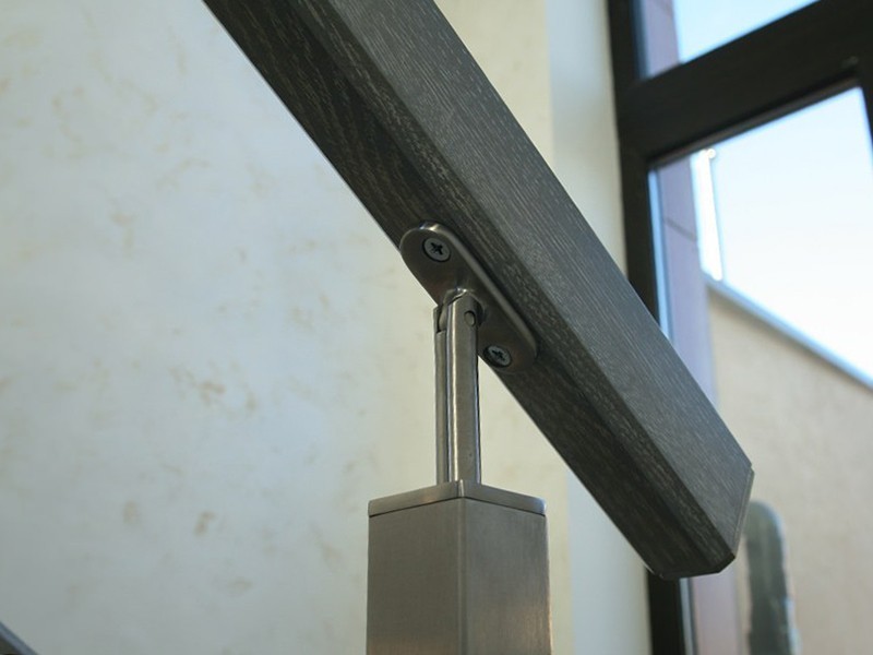 Ограждение лестницы со стеклом, тонированным в массе, стойки и завязки поручня из латуни