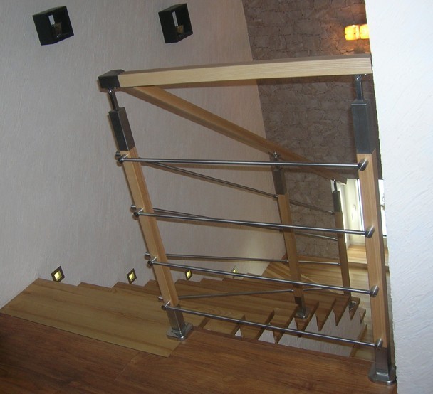 Нержавеющие ограждения без ригелей с круглым поручнем и стойками с деревянными вставками