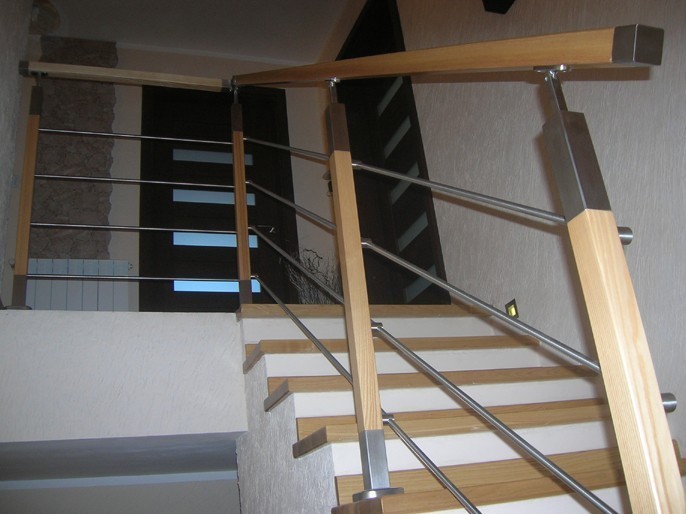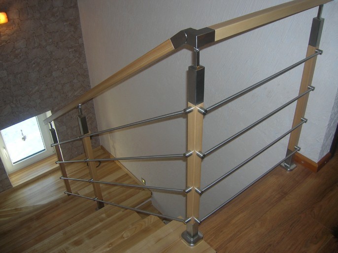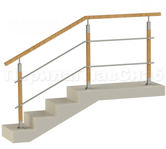 Три ригеля на сварке, квадратный деревянный поручень и круглые стойки