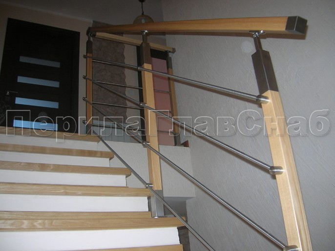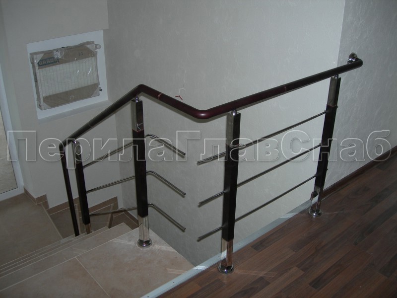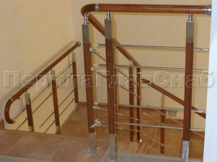 Три ригеля на сварке, квадратный деревянный поручень и круглые стойки