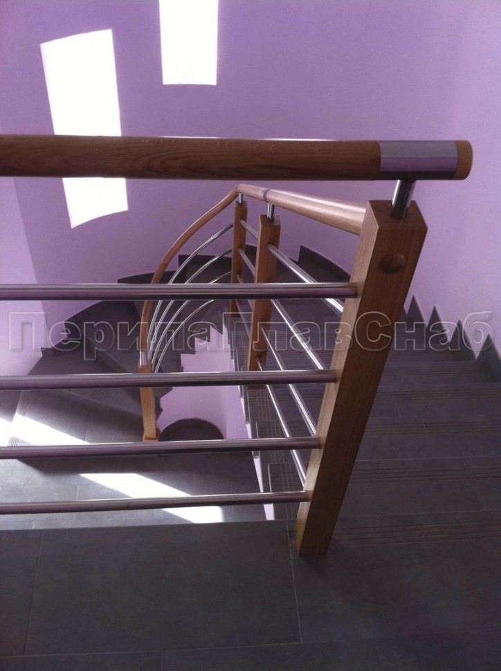Нержавеющие ограждения без ригелей с круглым деревянным поручнем и стойками с деревянными вставками