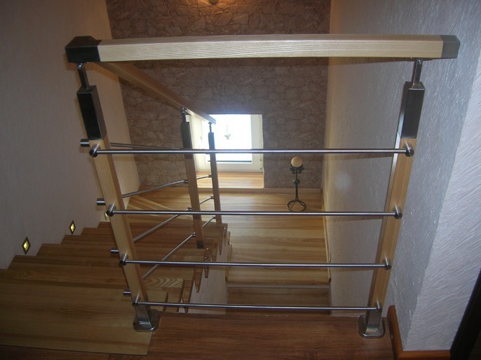 Три ригеля на сварке, квадратный деревянный поручень и круглые стойки