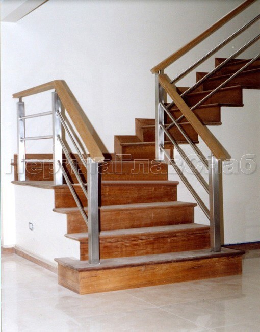 Ограждения с двумя стойками в каждую ступень с деревянным поручнем и без ригелей