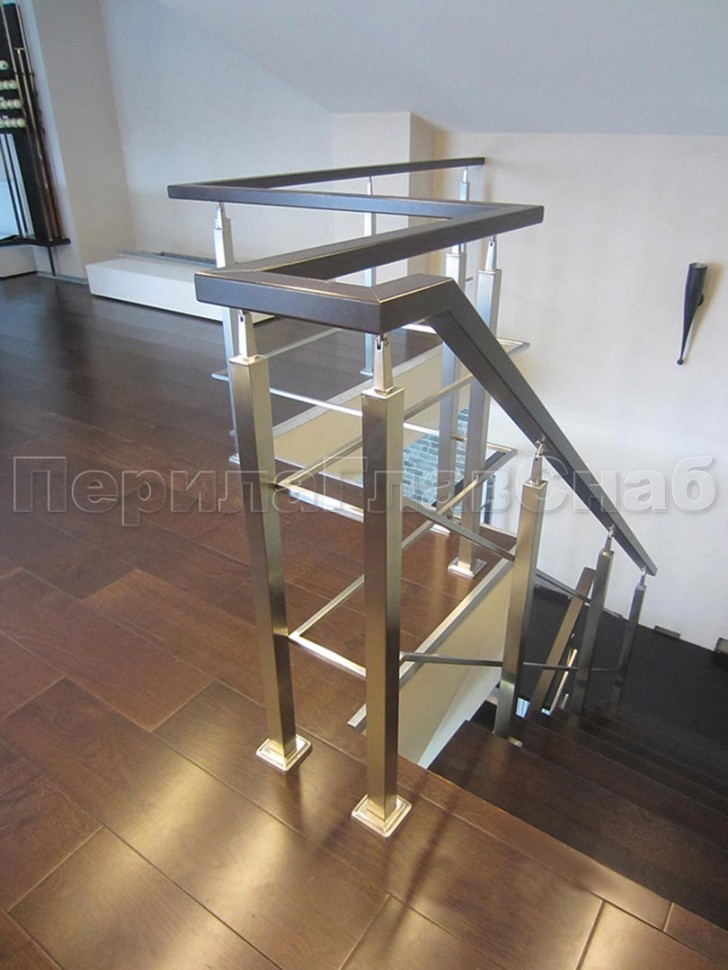 Четыре ригеля на держателях, квадратный деревянный поручень и квадратные стойки