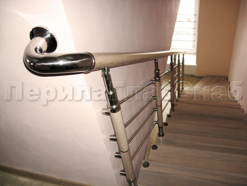 Четыре ригеля на держателях, квадратный деревянный поручень и стойки с деревянными вставками