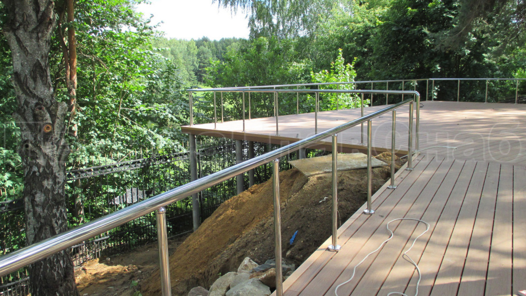 Нержавеющие ограждения без ригелей с круглым поручнем и стойками с деревянными вставками в Новосибирске. Готовые проекты ПерилаГлавСнаб