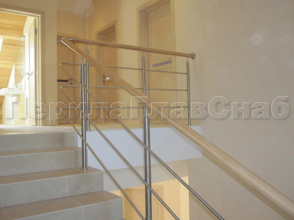 Три ригеля на сварке, квадратный деревянный поручень и круглые стойки