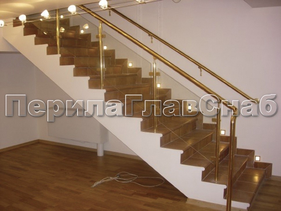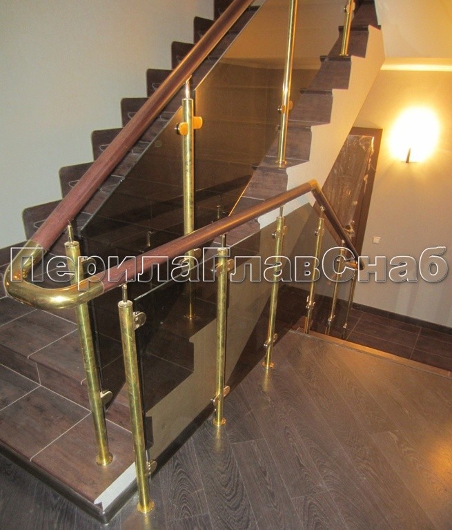 Ограждение лестницы с прозрачным стеклом, стойками и поручнем из латуни в Новосибирске. Готовые проекты ПерилаГлавСнаб - фото 1 Ограждение лестницы с прозрачным стеклом, стойками и поручнем из латуни в Новосибирске. Готовые проекты ПерилаГлавСнаб - фото 2