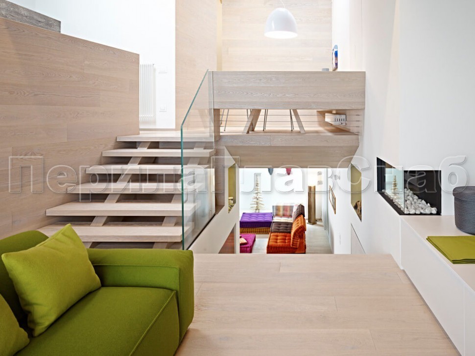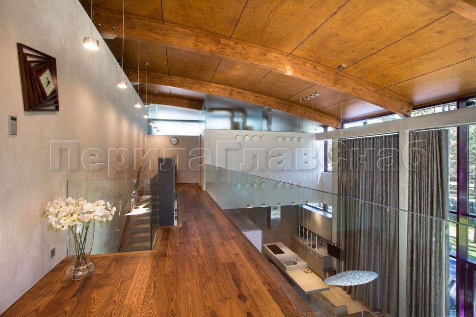 Ограждение с деревянным поручнем на точечном креплении на лестнице