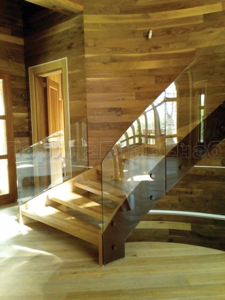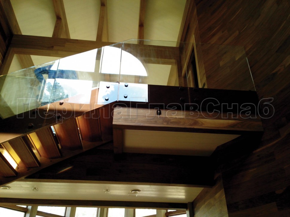 Ограждение с деревянным поручнем на точечном креплении на лестнице